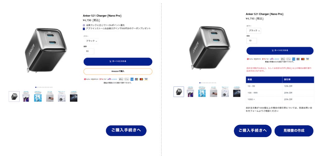 「Anker for Business」は、法人のお客様の利便性を追求し、法人価格での注文、見積書発行、そして支払いまで一気通貫で完了できる法人向けの公式サイトです。従来は窓口への対応でのみ導入に関するお問合せを承っていましたが、本サイト上で手間なく製品1個からの購入が可能な他、自動見積もり機能によって時間を短縮し、スムーズに製品の導入をご検討いただけます。