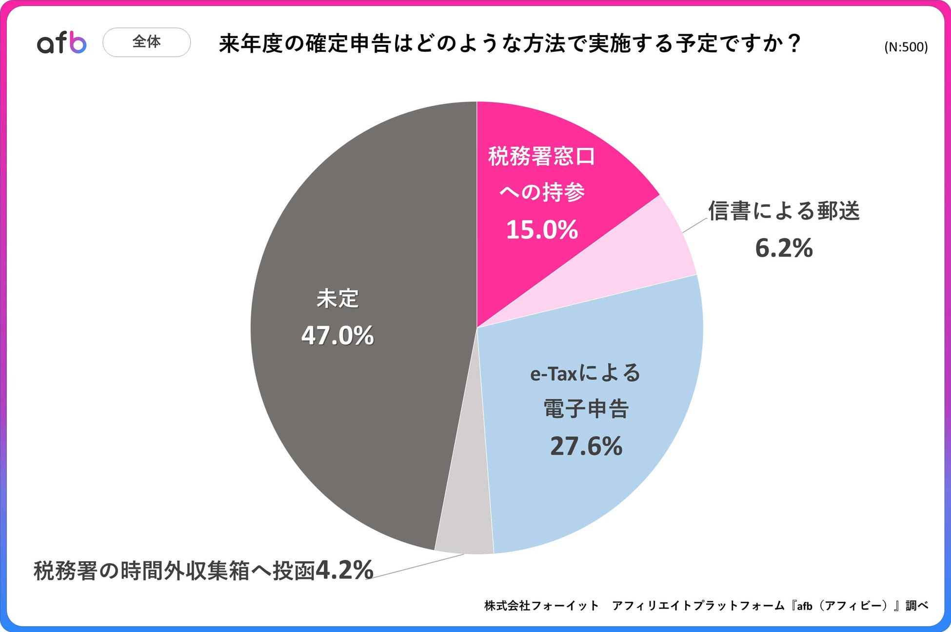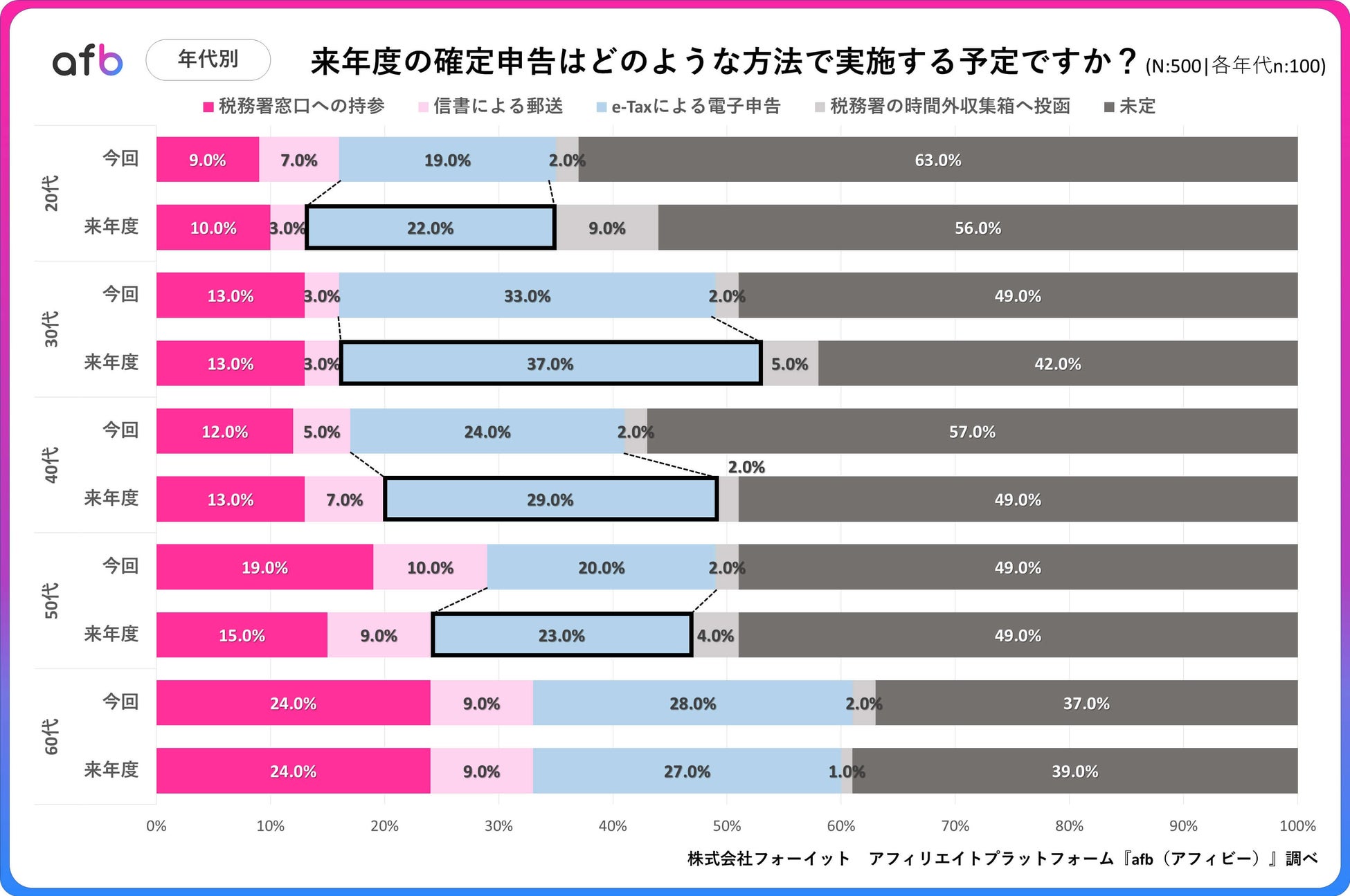 アフィリエイトプラットフォーム「afb(アフィビー)」< https://www.afi-b.com/ >の開発運用をおこなう株式会社フォーイットは、全国の20代~60代までの男女500人を対象に確定申告に関するアンケートを実施し、年代別等の特徴についてまとめました。