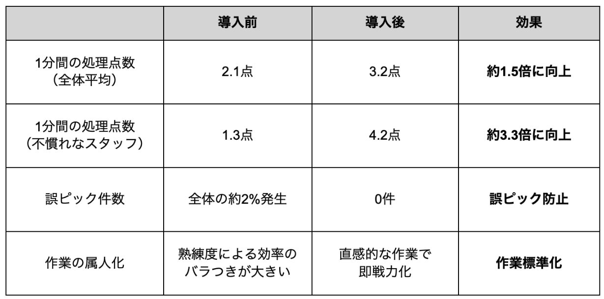 さらに、バーコードスキャンによる正誤判定が可能になったことで、導入前に約2%発生していた誤ピックの件数がゼロとなり、作業の正確性も向上。結果として、サービス品質を高める業務に時間を充てられるようになり、ネットスーパー事業全体の品質と収益性の向上を大きく後押しする効果をもたらしました。