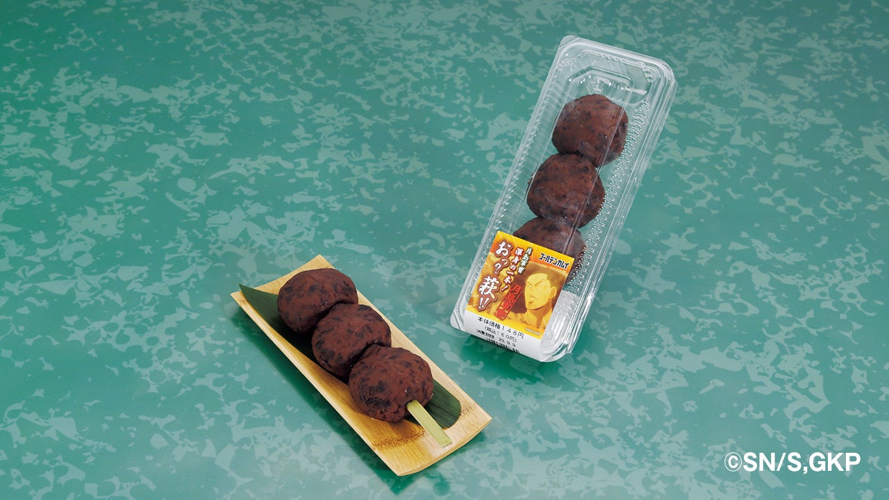 月島軍曹の好物である白米から連想したおはぎです。国内産道明寺を使用した1個約55gのつぶあんおはぎを3個、串にさしました。