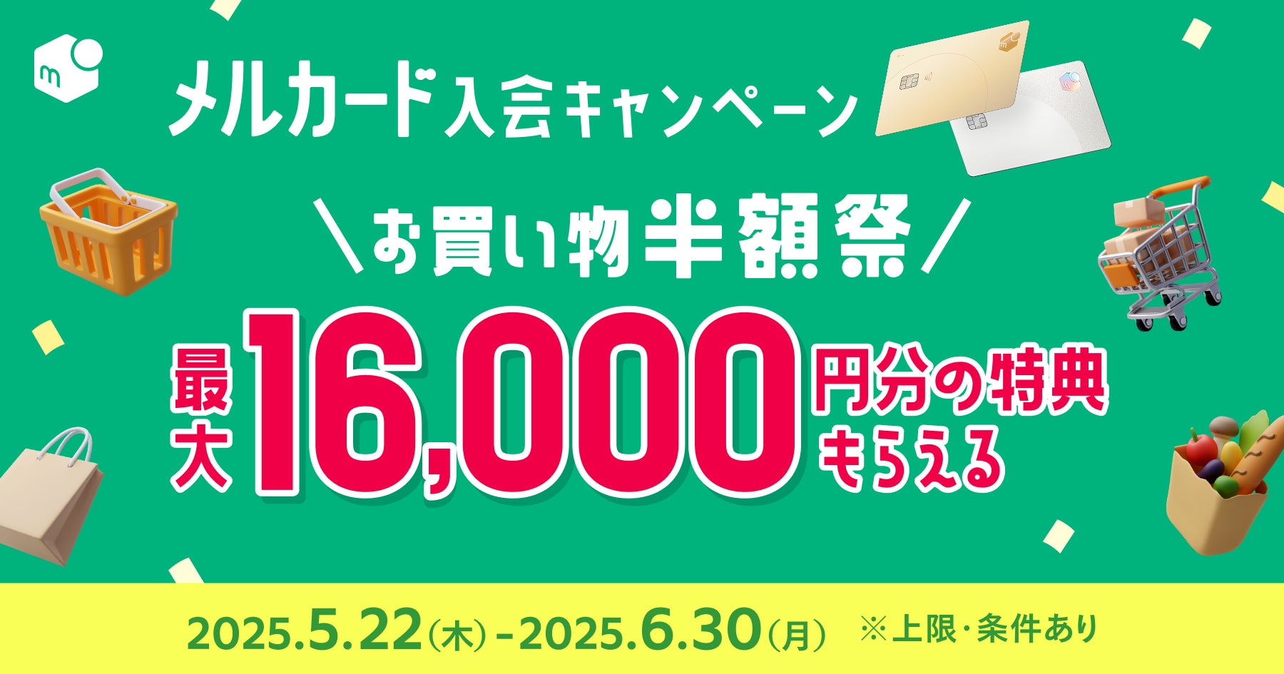 株式会社メルペイ(以下、メルペイ)は、2025年5月22日より、「メルカード」「メルカード ゴールド」(以下、メルカードおよびメルカード ゴールドを総称して「メルカード」)の新規入会や利用で、「メルカリ」でのお買い物に使える最大半額クーポン(※1)や販売手数料の最大50%相当が還元されるクーポン(※2)など、最大16,000円分の特典(※3)がもらえるキャンペーンを開催いたします。