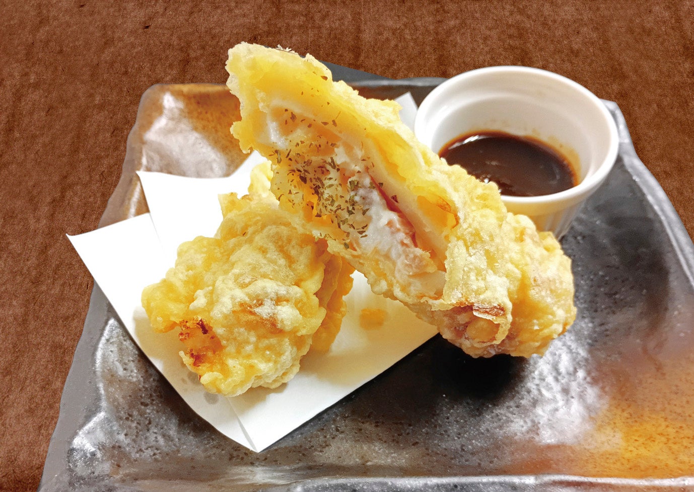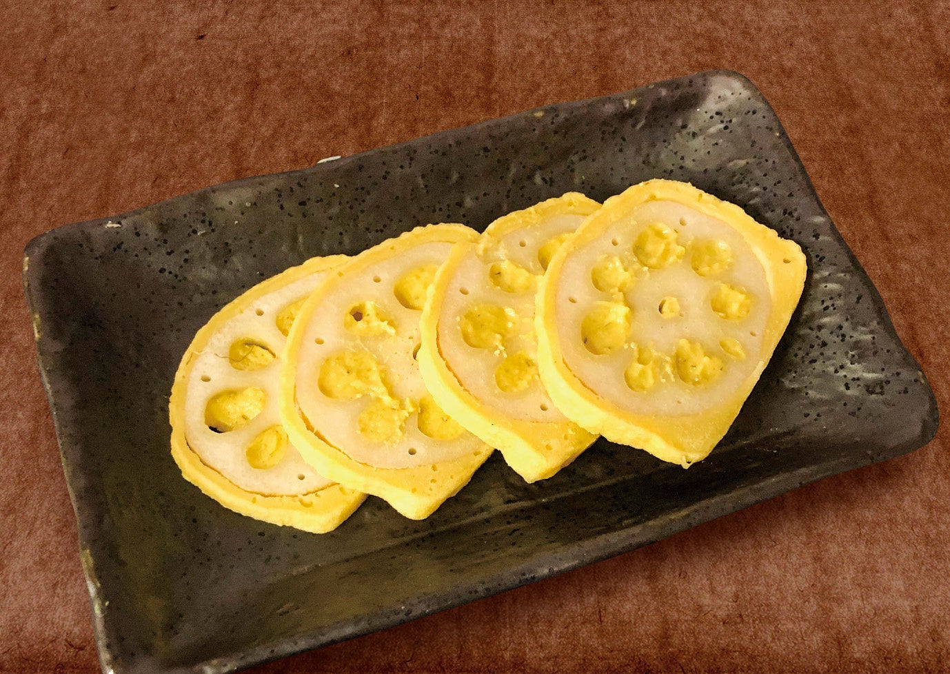蓮根の穴に詰め込んだ“からしみそ”のマイルドな辛さとシャキシャキした歯ごたえ抜群の食感をお楽しみください。