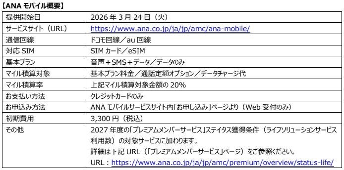 ANA X株式会社(代表取締役社長:神田 真也、本社:東京都中央区、以下「ANA X」)は、MVNO事業に参入し、2026年3月24日(火)より、モバイル通信サービス「ANAモバイル」の提供を開始いたします。ご契約・ご利用いただくことで、月額料金*に対し20%の積算率でANAのマイルが貯まります。