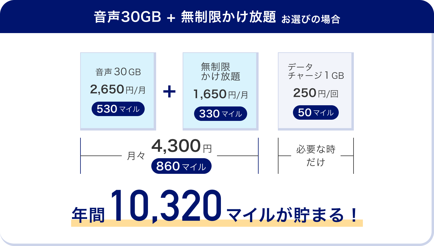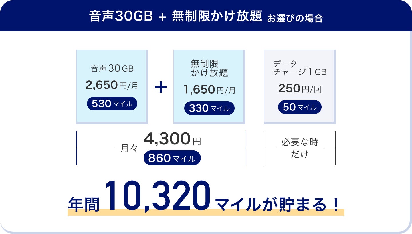 「ANAモバイル」では、例えば音声30GBプラン+無制限かけ放題の通話定額オプションをご契約・ご利用いただくと、月々4,300円のお支払いで860マイルが貯まり、年間で10,320マイルが貯まります。更に、初月は500マイルをプレゼントいたします。貯まったマイルは、ANAの特典航空券への交換をはじめ、「ANA Pay」や「ANA Mall」などANAグループが展開する様々なサービスで幅広くご活用いただけます。