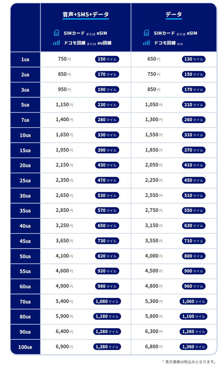 「ANAモバイル」は、SIMカードとeSIMに対応し、通信回線は「ドコモ回線」・「au回線」より選択いただけます。新規契約はもちろん、現在ご利用中のスマートフォン・電話番号はそのままで、乗り換えてご利用いただけます。データ容量は、お客様のご要望にお応えできるよう1GBから100GBまでの豊富なプランをご用意しました。