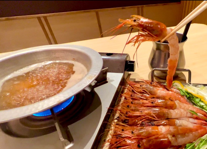 ぷりっぷりの赤海老を自慢の海老出汁でしゃぶしゃぶする、海老しゃぶしゃぶがスタート!!