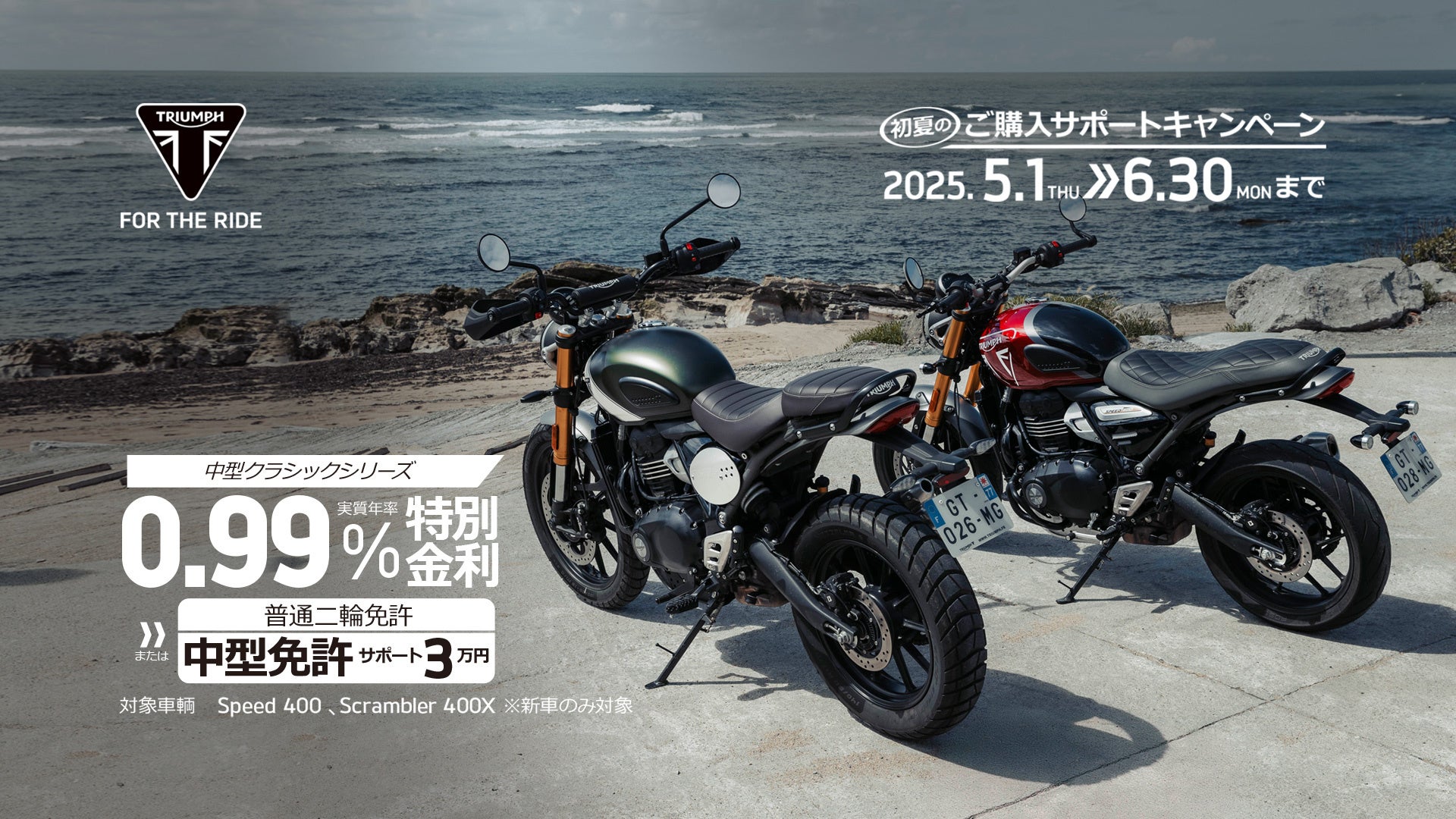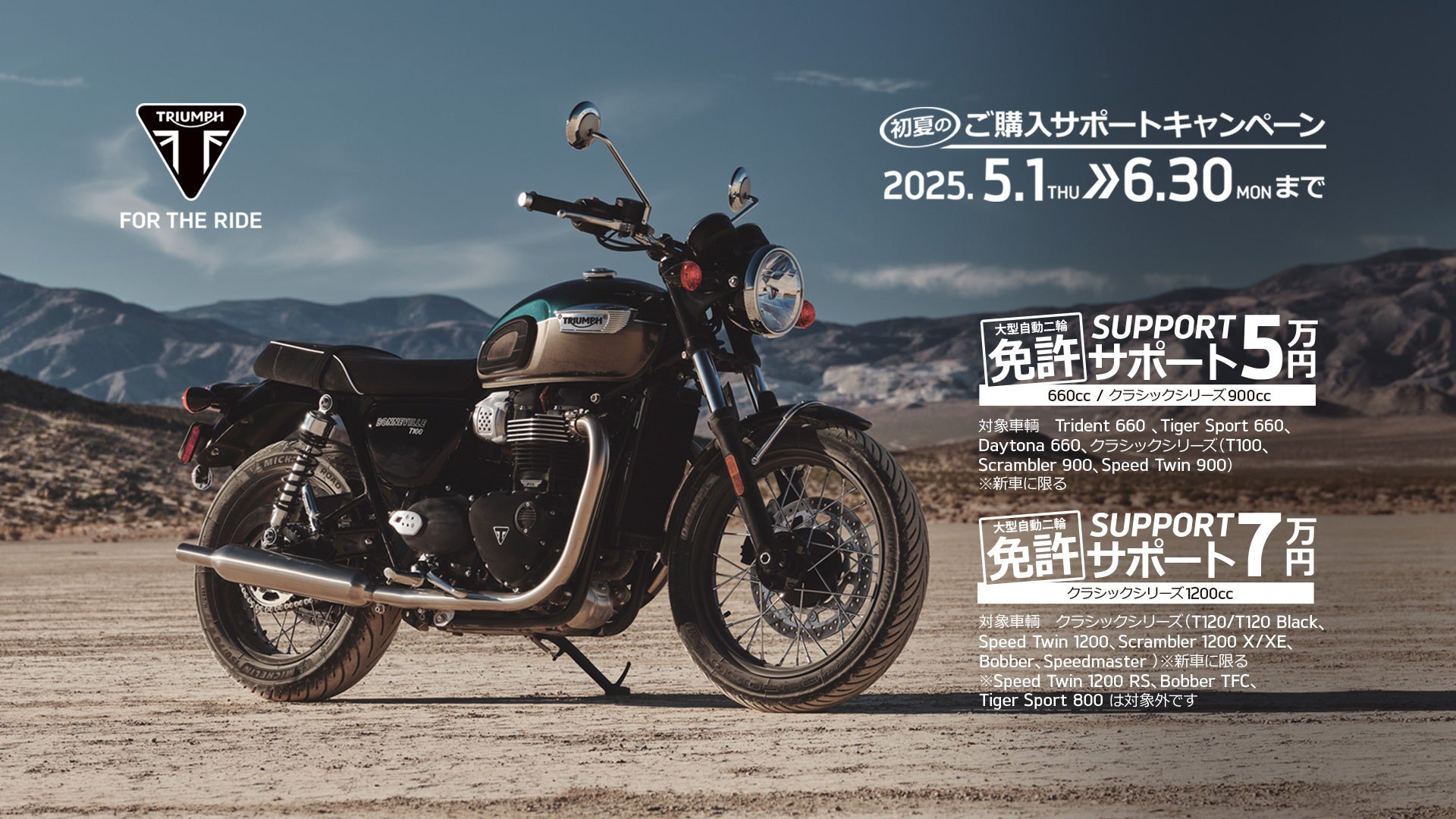 トライアンフモーターサイクルズジャパン株式会社(代表取締役社長:大貫 陽介 - 東京都港区) は、5月1日(木)~ 6月30日(月)までの期間中、全国のトライアンフ正規販売店にて、初夏の「ご購入サポートキャンペーン」を実施する事をお伝えします。