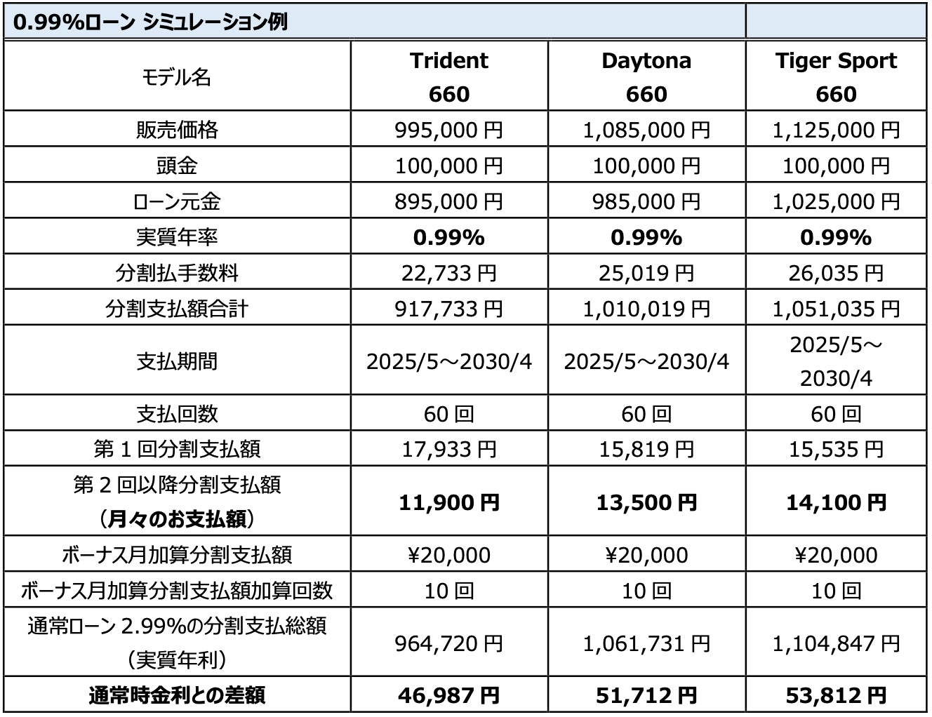 ■Trident 660、Tiger Sport 660 、Daytona 660 0.99%特別金利ローン キャンペーン