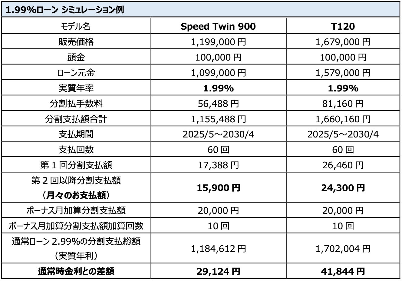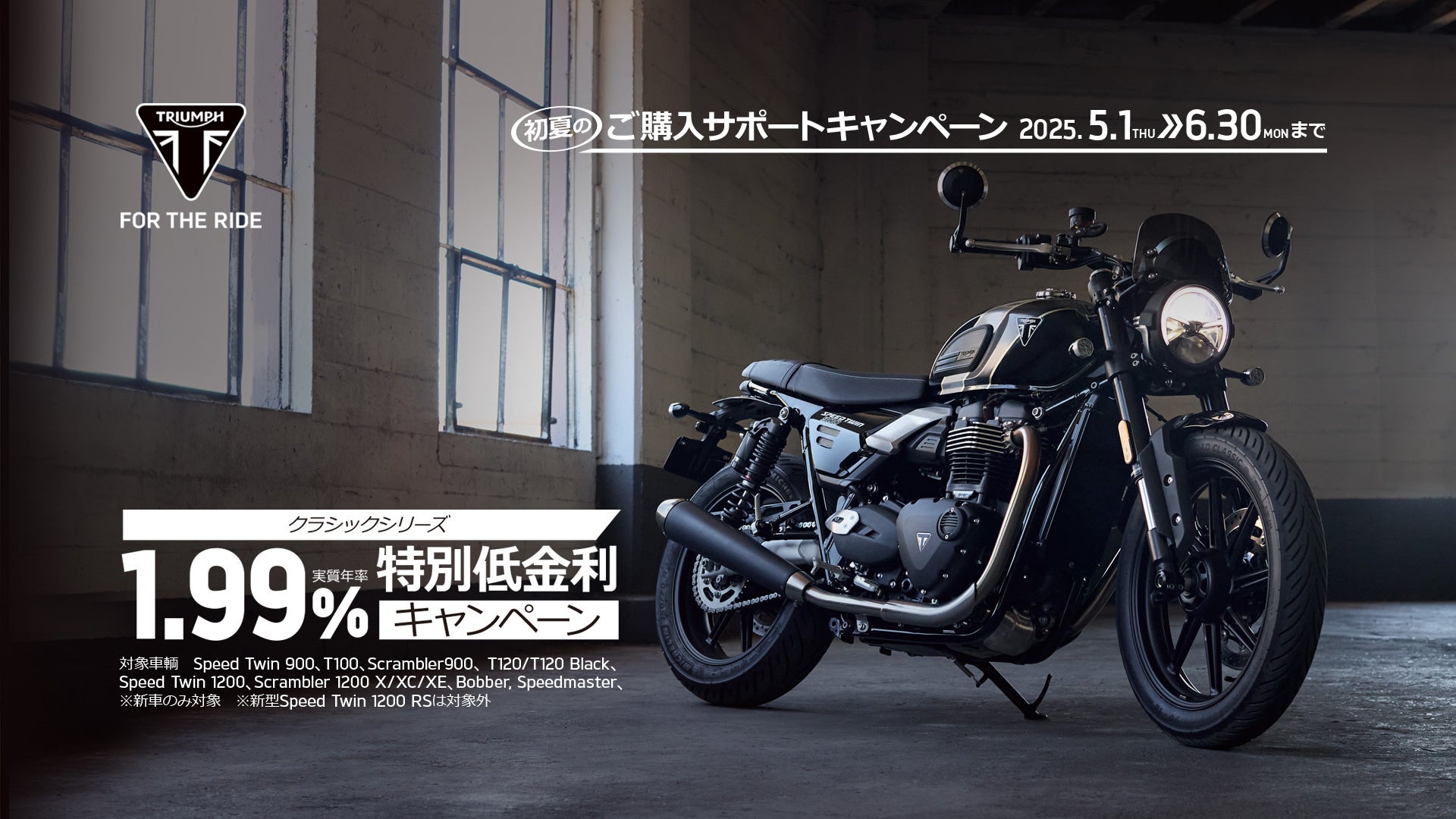 0.99%特別低金利ローン:期間中、全国のトライアンフ正規販売店にて対象車両をご成約、且つローン契約を完了していただいたお客様に、「0.99% 特別金利ローン」をご提供します。