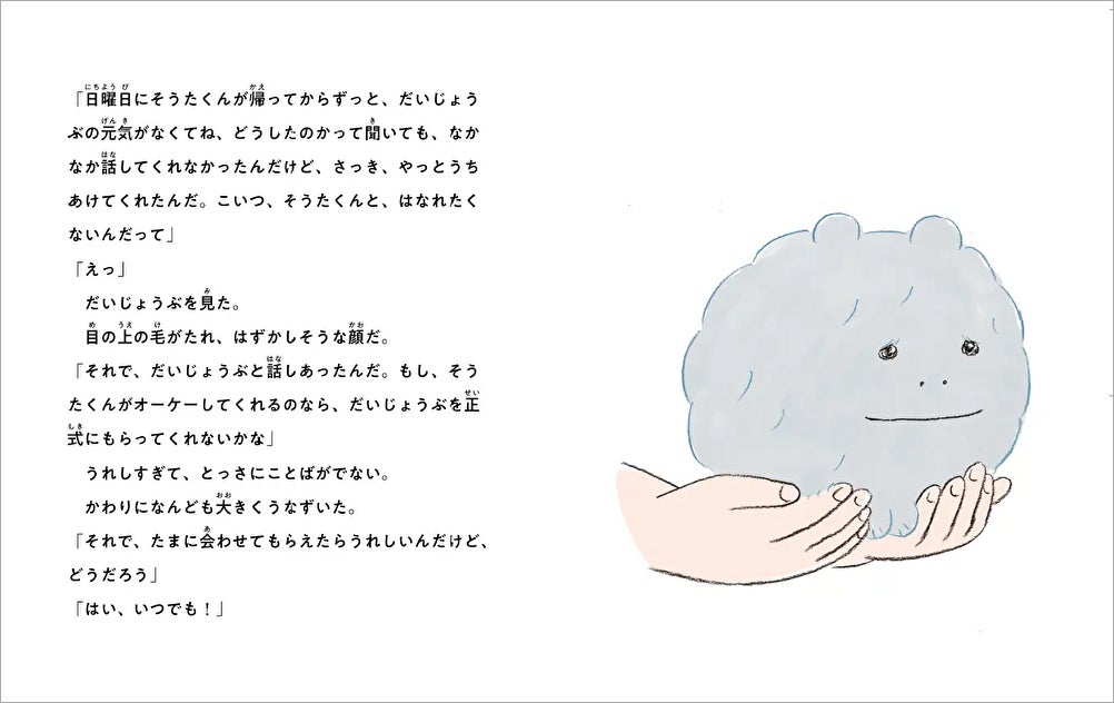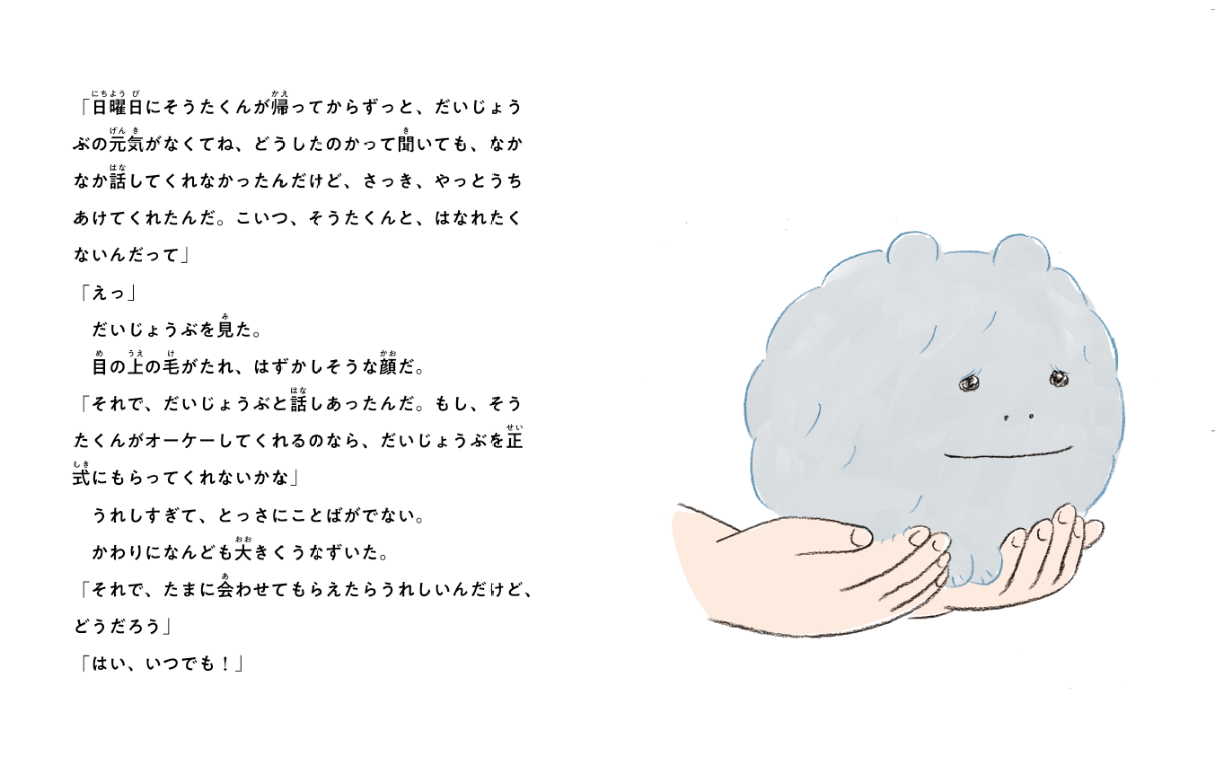 新しいクラスになじめない小学生の「そうた」がリサイクルショップで出会ったのは、人と話が出来るぬいぐるみの「だいじょうぶくん」。訳があって売られてしまっただいじょうぶくんから、持ち主の「まりちゃん」を一緒に探してほしいとたのまれます。しかし、だいじょうぶくんを売ったのが怪しい男だったことがわかって……!