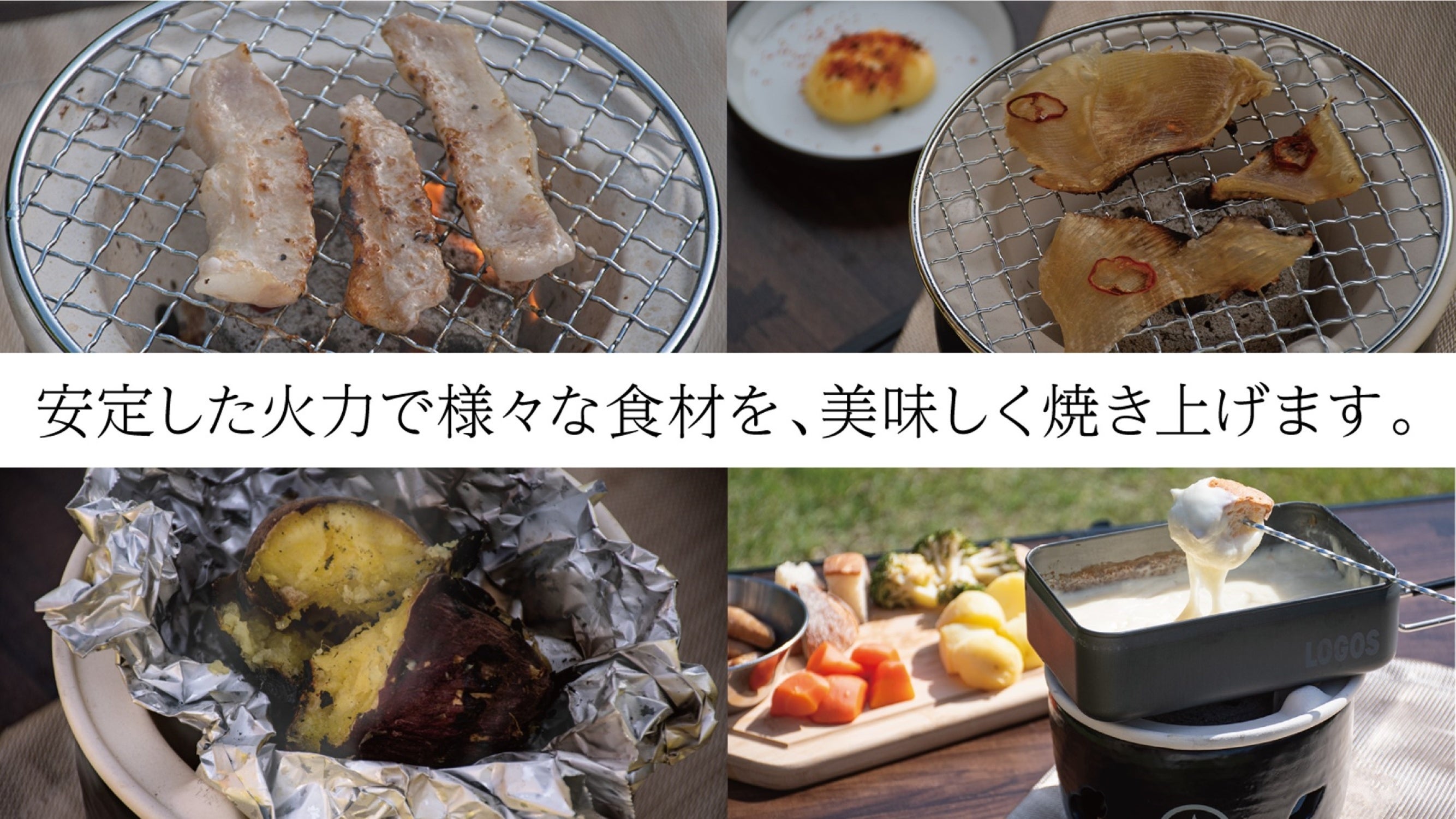 陶器製の本体に水を溜め、その上に火床を乗せて炭に着火する水コンロなので、本体に熱が伝わるのを防ぎ、コンロからの熱でテーブルが焦げるリスクを軽減します。長時間加熱しても温度が上がり過ぎないため、優しくじんわりと加熱して旨みを閉じ込める調理に最適で、よく火を通す必要がある豚肉や鶏肉、表面が焦げやすい焼きおにぎりなどを、外側は焦がさずにじっくりと焼き上げることができます。使いやすいサイズ感かつ軽量であり、使用後は洗剤で洗えて手入れも簡単なので、キャンプはもちろん、お庭やベランダでのちょっとしたBBQにもぴったりです。さらに、職人の手作業も加わったこだわりのシルエットは、インテリアとしても活躍します。