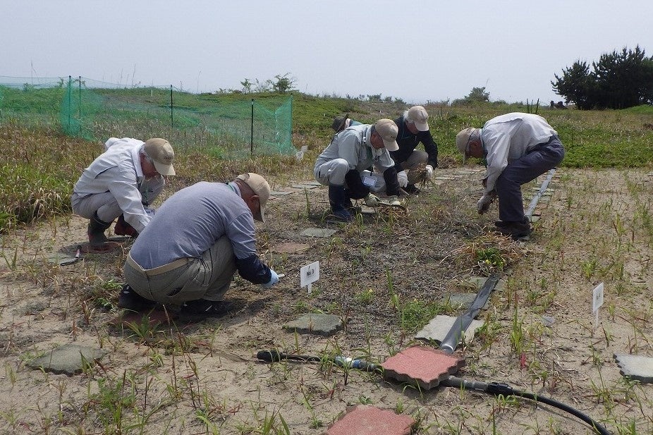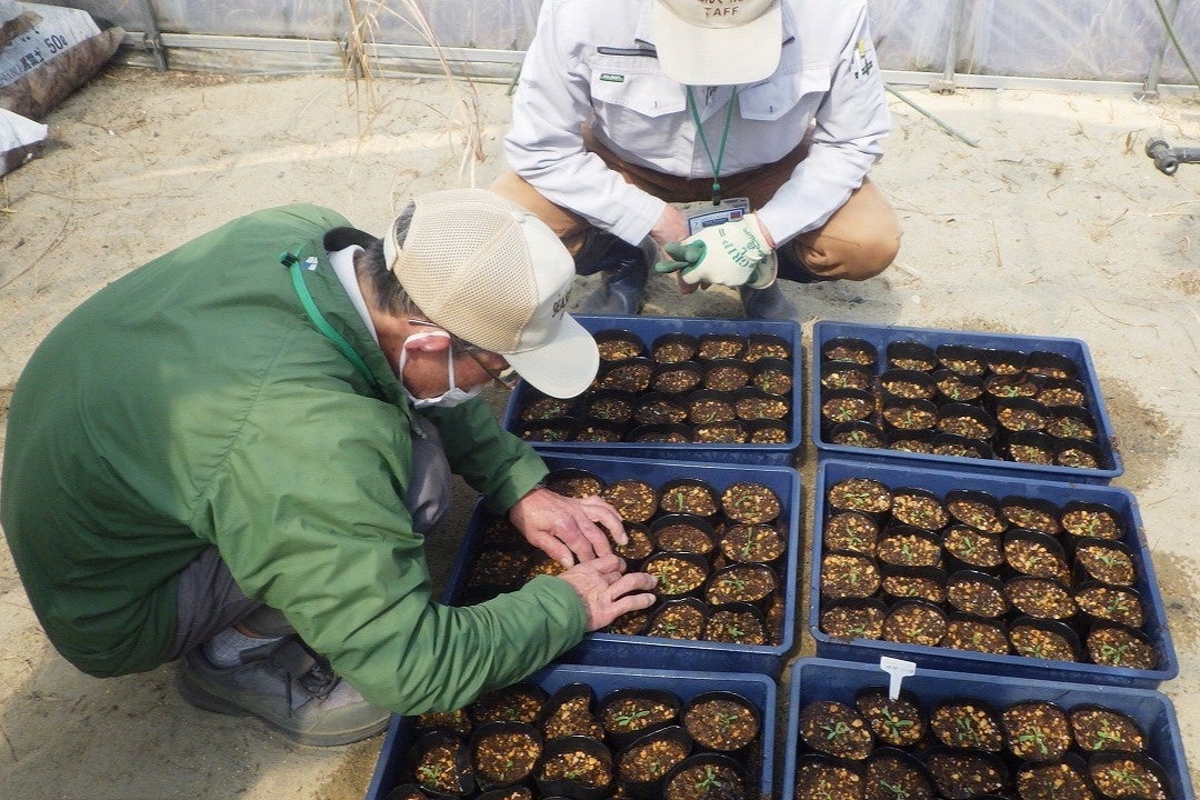 ひたち海浜公園では、絶滅が危惧されるハナハタザオの保護・増殖を目的に、公園のボランティア「野生植物パートナー」との協働で保全活動を行っています。6月に株数調査を行い、9月に採種。10月~4月で苗を育て、5月に砂丘エリアへ定植。これらの作業の実施状況を細かに記録しています。