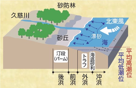 ハナハタザオが自生する砂丘エリアは、久慈川からの砂が海岸に堆積し、北東風によって押し上げられることで形成された地形です。近年は周辺の開発等により砂の供給が減少し、砂丘の景観や海浜植物の生育環境に大きな影響が出ています。この貴重な環境と植物たちを守るために、当公園では保全活動を継続的に実施しています。
