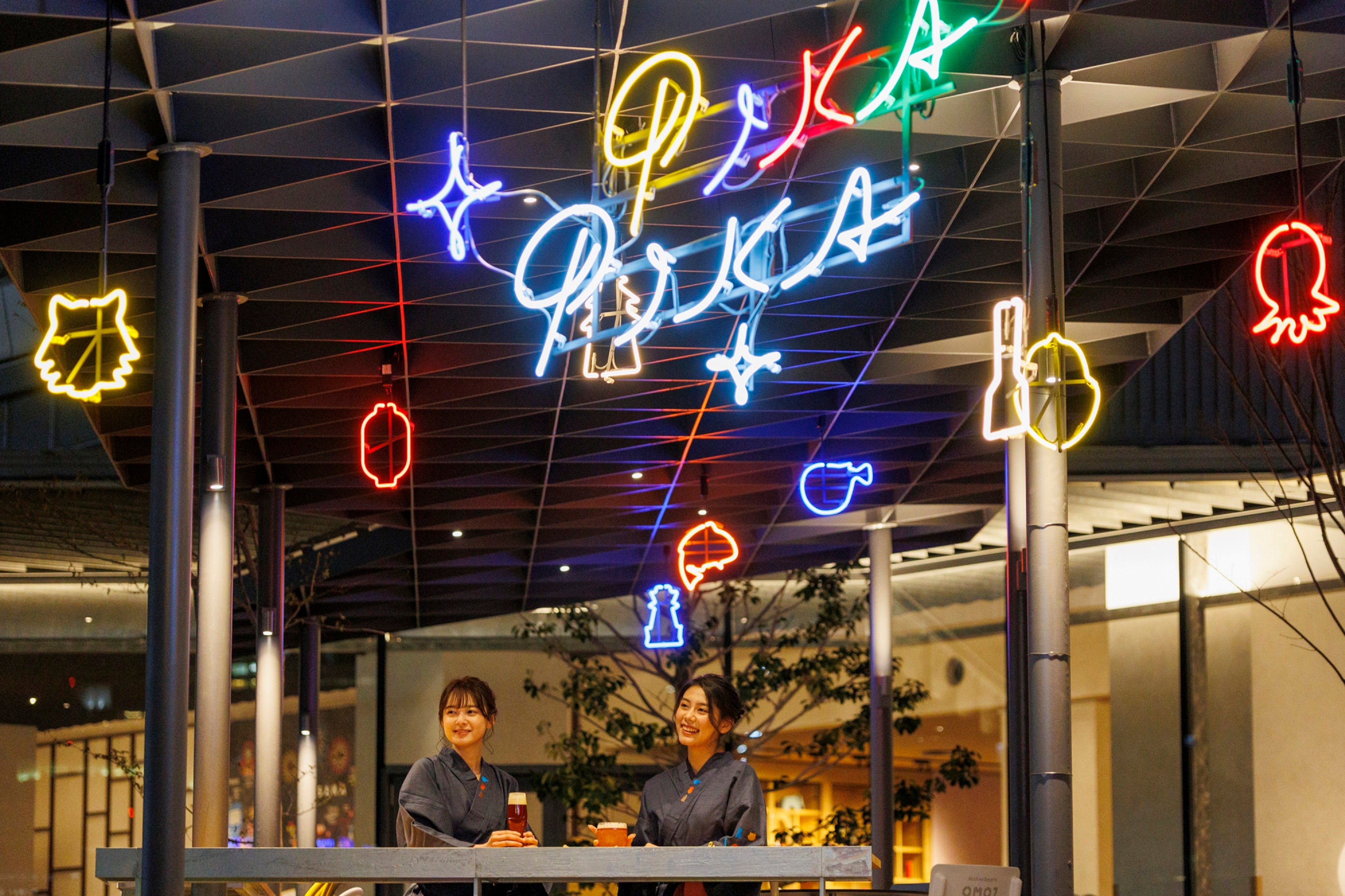 ガーデンエリア「みやぐりん」で、大阪がテーマのネオンアートや、光の花火を眺めながら、提灯を手元に浴衣でそぞろ歩きを楽しめる宿泊者限定のナイトイベントです。みやぐりんに設置された「湯上りご近所スタンド」では、ご近所さんのクラフトビールとたこ焼きのふるまいを堪能できます。