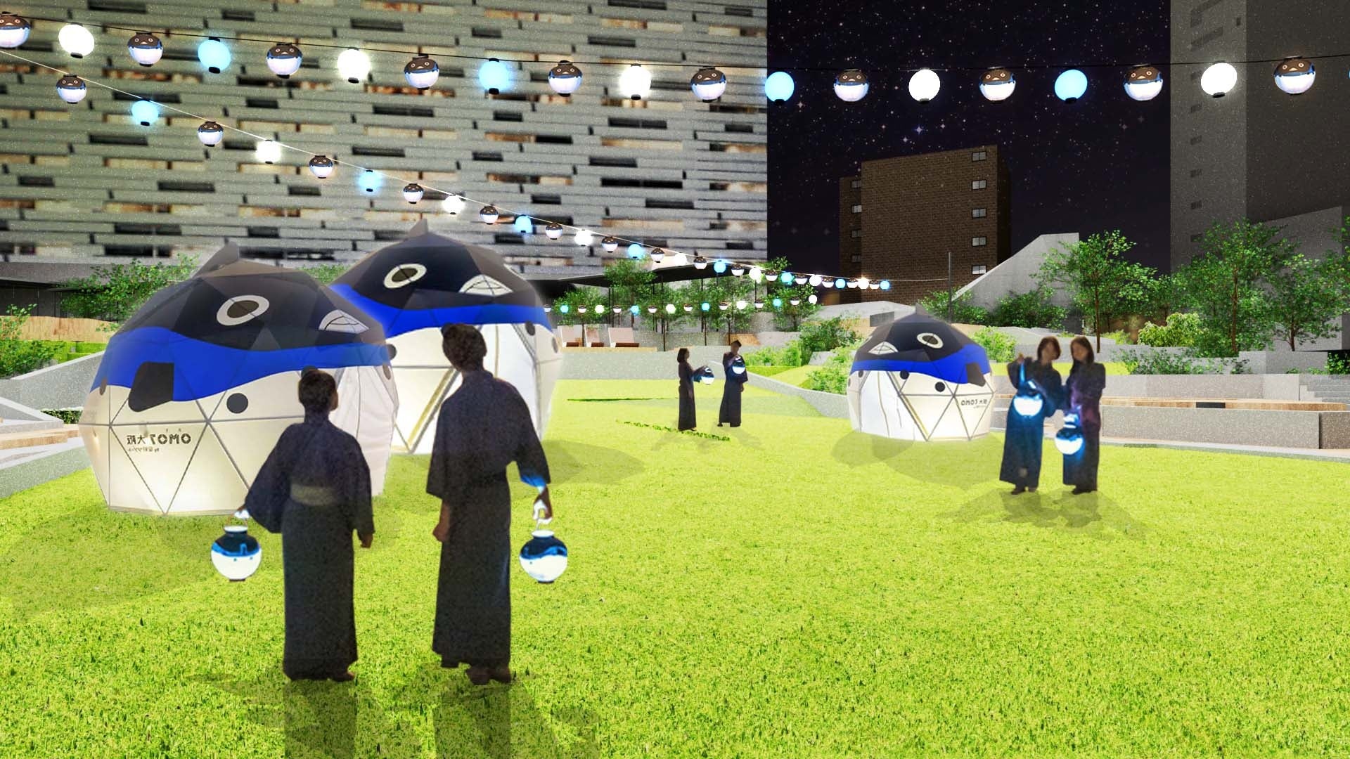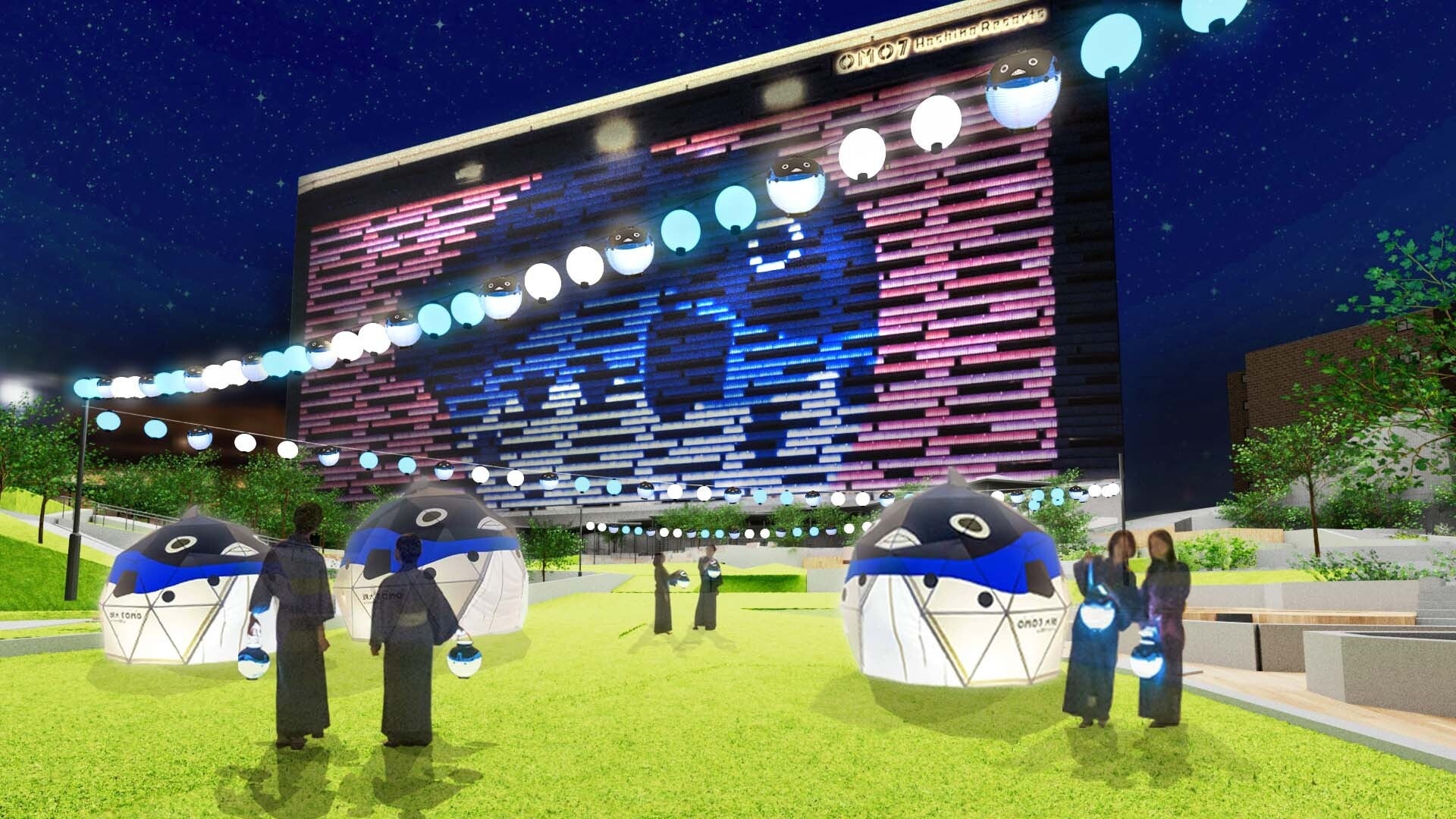 OMO7大阪のホテル棟の目の前に広がるガーデンエリアみやぐりんの上空に、ふぐ提灯が登場します。海が住処のふぐですが、夜空を浮遊している姿はなんとも愛らしく、ついつい写真を撮りたくなる光景です。