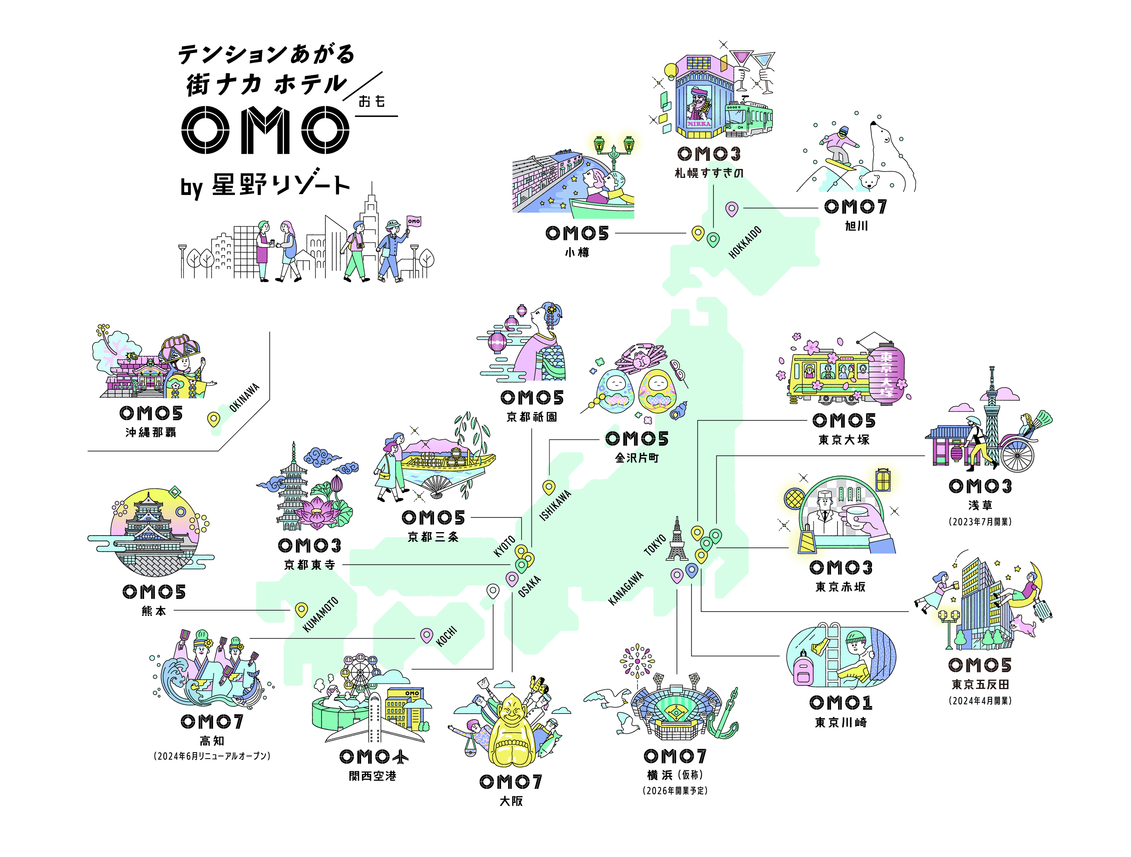 「OMO」は星野リゾートが全国に展開する「テンションあがる『街ナカ』ホテル」。街をこよなく愛するスタッフが地域の方々と仕掛ける、新感覚のホテル。思いもよらない魅力に出会い、知らず知らずのうちにその街までお気に入りに。現在15施設を展開し、2023年7月には「OMO3浅草」が誕生。2024年には、「OMO5東京五反田」の開業、「OMO7高知」のリニューアルオープンを予定しています。