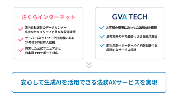 こうした課題を解決するため、GVA TECHとさくらインターネットは本契約を締結し、さくらインターネットの国内データセンターで完結するインフラ基盤上で、安心して生成AIの性能を最大限活用できる法務AXサービスを提供することといたしました。