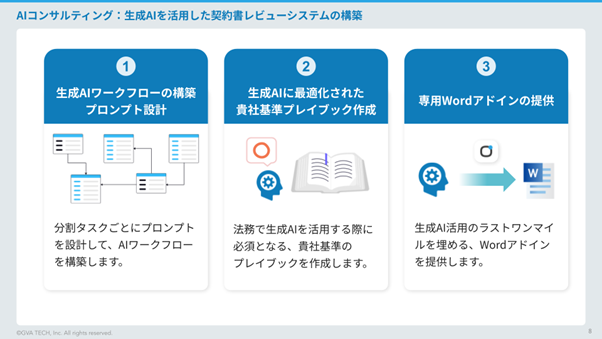 「OLGA AIコンサルティング」により、契約書チェック業務について、自社のひな型や基準、プレイブックに即した条文の修正案や修正コメントの作成まで、Word内での完全自動化が可能になります。