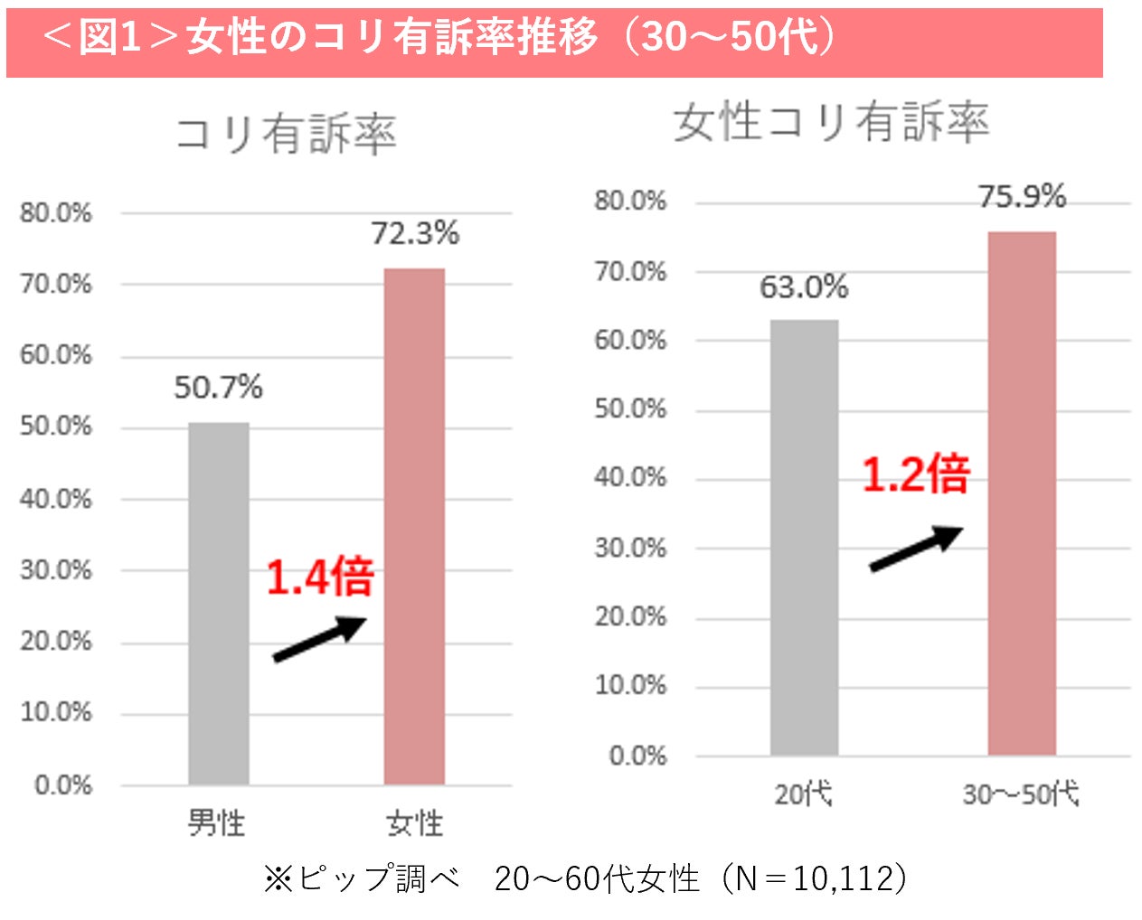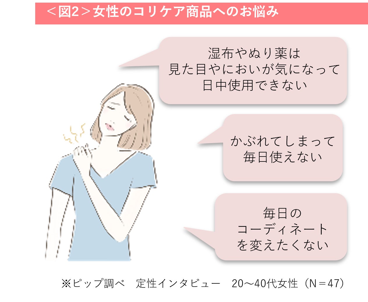 コロナウイルスの流行が収まり、在宅勤務からオフィスへの通勤が増えたこともあり、コリケア市場規模は毎年拡大を続けています。女性のコリの有訴者についても毎年大きく変わらず7割以上の方がコリの悩みを感じており、特に30~50代は有訴率が高い傾向です<図1>。女性はコリの有訴者が多いにも関わらず、日中のケアはなかなかできていない方が多く、そこには「ケアしていることを知られたくない」「いつものファッションを変えずにケアがしたい」などの悩みを抱えていることが明らかになりました<図2>。