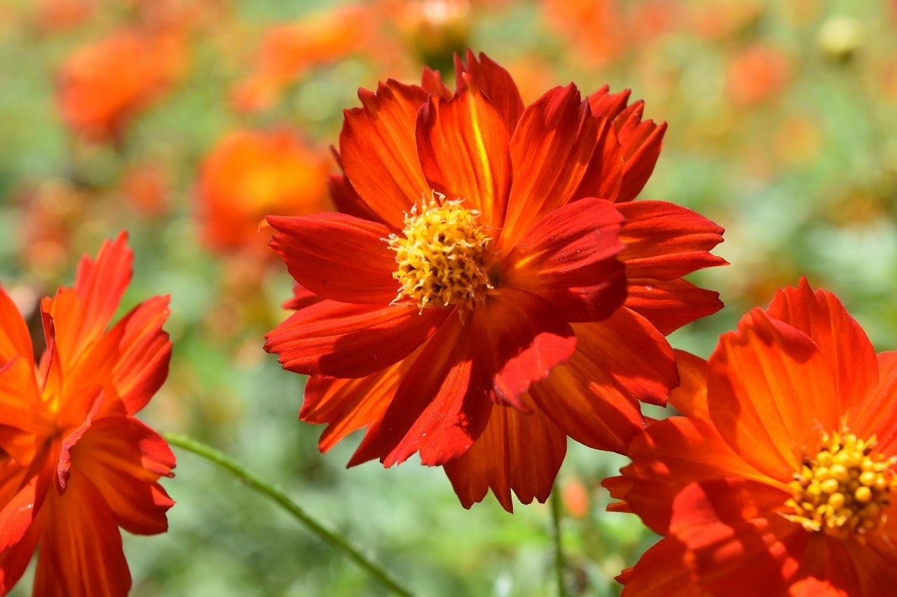 今年は酷暑や豪雨の影響を受けていますが、スタッフが日々細やかに管理を行っており、草丈がやや小ぶりながらも可憐な花々をお楽しみいただけます。一足早く8月末から早咲きコスモスの「レモンブライト」や「ロードスカーレット」が開花しています。