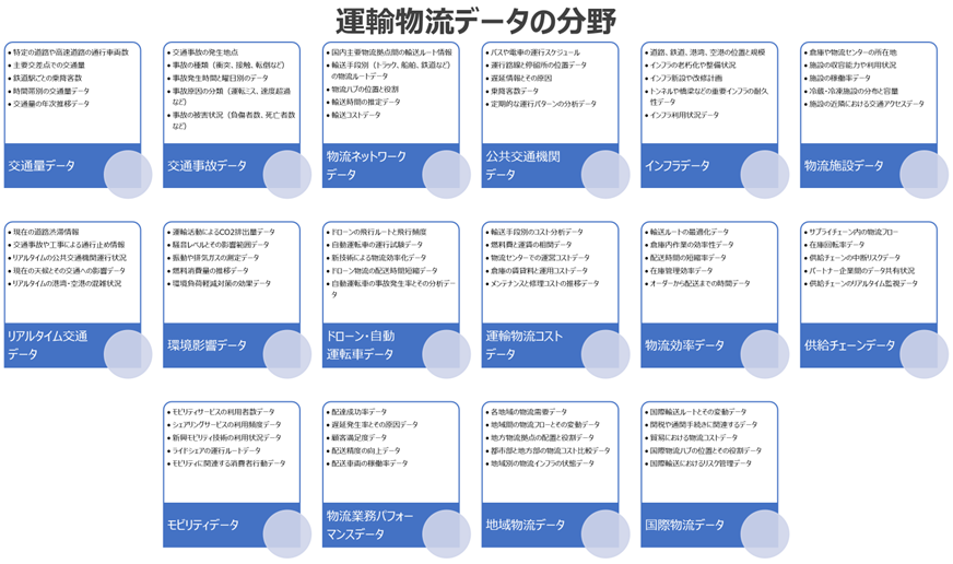 運輸物流分野におけるオープンデータの重要性が増す中、その内容は多岐にわたります。オープンデータは、業界の効率化、コスト削減、環境負荷の低減、リスク管理の強化において、不可欠なツールとして機能しています。また、グローバル化や消費者ニーズの多様化に対応するための戦略的な意思決定を支援する重要な要素となっています。運輸物流分野で公開されているオープンデータの具体的な内容を紹介します。