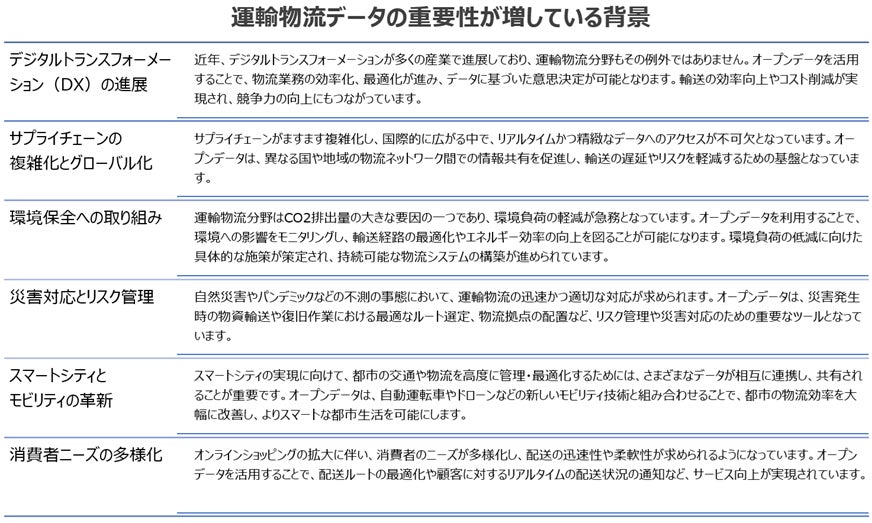 これらの要因により、運輸物流分野のオープンデータは、産業全体の発展や革新、そして社会的な課題解決のために欠かせない要素となってきています。データを活用した新たなサービスや技術の開発が期待されており、今後もその重要性はさらに増していくと考えられます。
