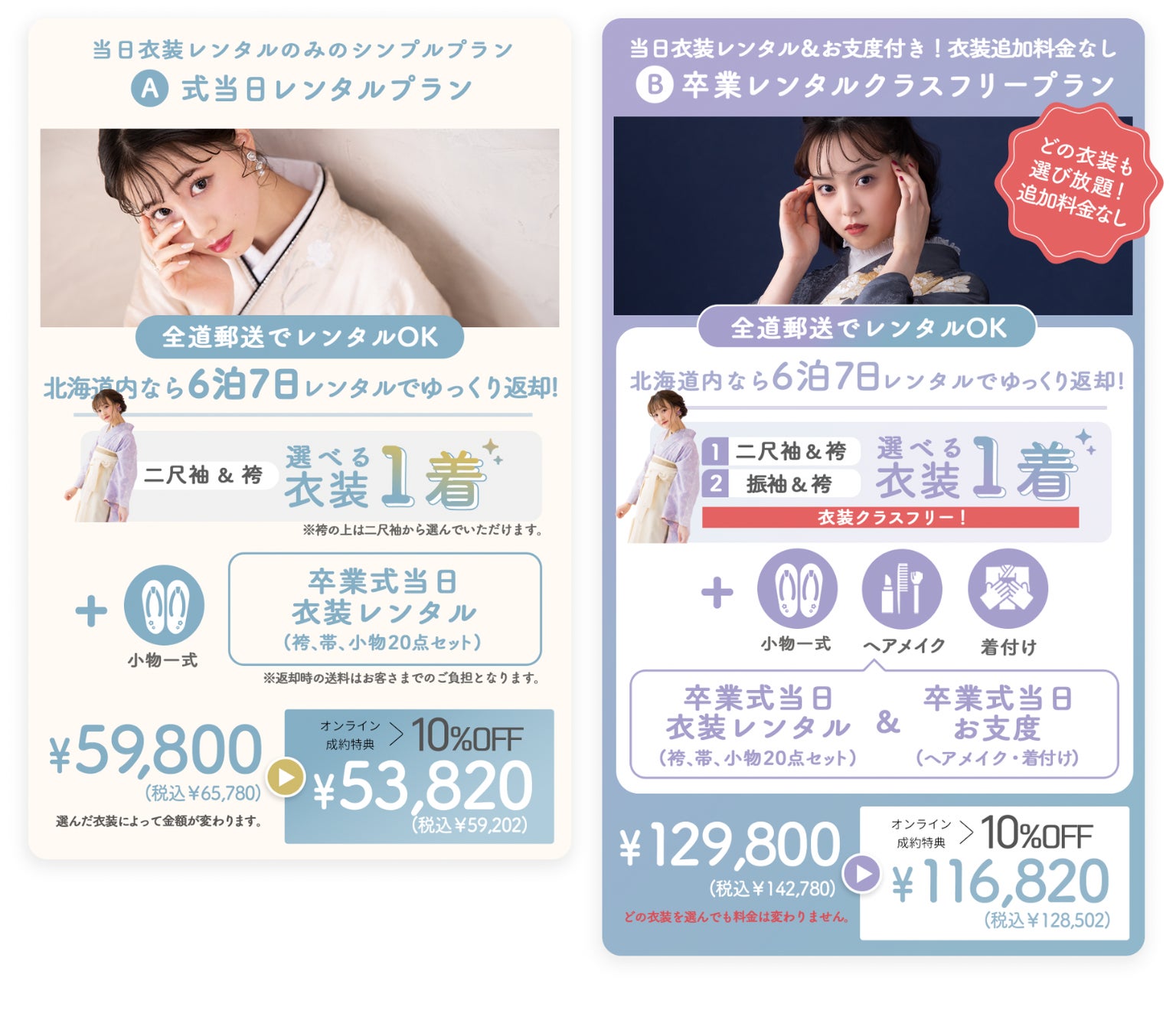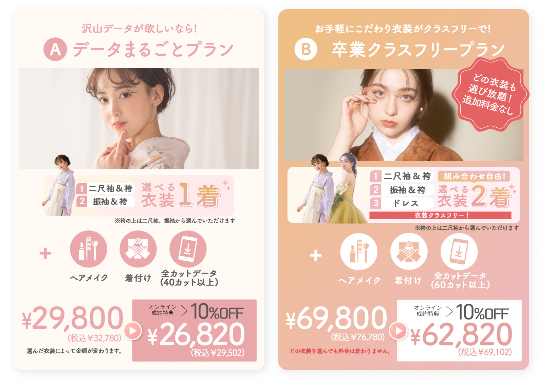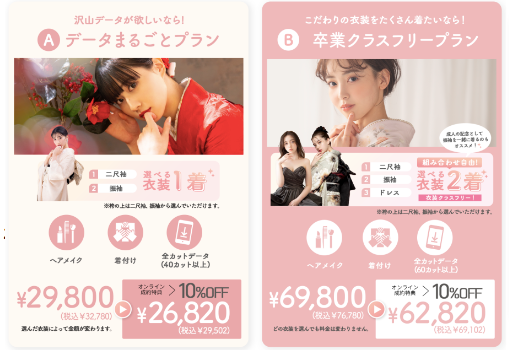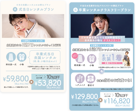 お支度込みで衣装ランクによって料金の変動がない、安心の ''卒業レンタルクラスフリープラン’’ や、