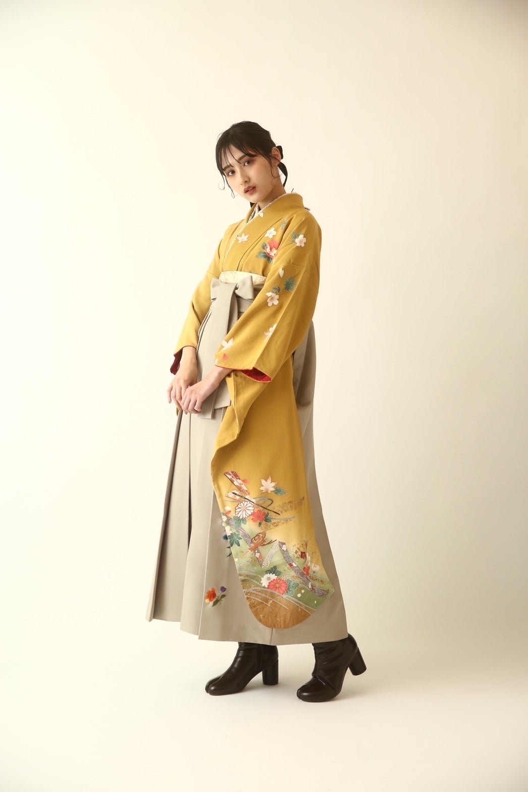 身長ジャストサイズを選べば草履をあわせてすっきり、ジャストサイズの一つ前のサイズを選べばブーツをあわせてピッタリのコンパクトスタイルにできます。丈を変えて足元を考えられるのも袴スタイルの魅力の1つ。