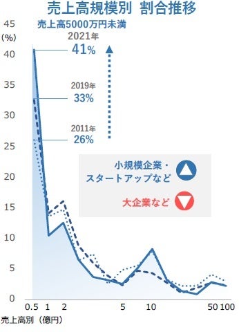 - 首都圏からの転出企業を売上高規模別にみると、最も多かったのは「1億円未満」(176社)で、多くが小規模な企業だった。なかでも、5000万円未満の小規模企業、設立間もないスタートアップの割合はコロナ前を大きく上回る