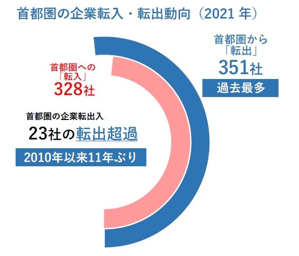 - 地方から首都圏へ本社を移転した企業は328社。この結果、2021年における首都圏の本社移転動向は、転出社数が転入を23社上回る「転出超過」となった。首都圏で転出超過となるのは2010年以来11年ぶり