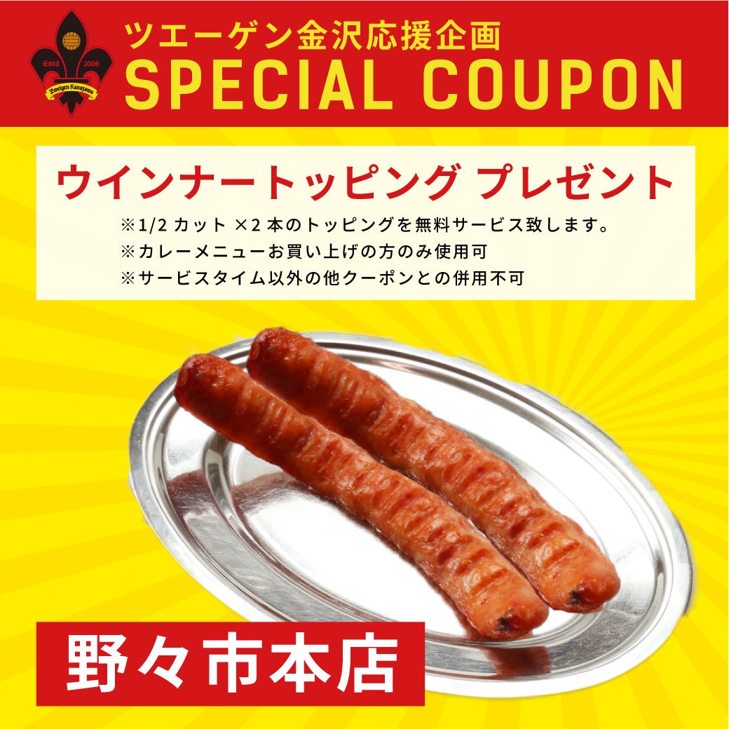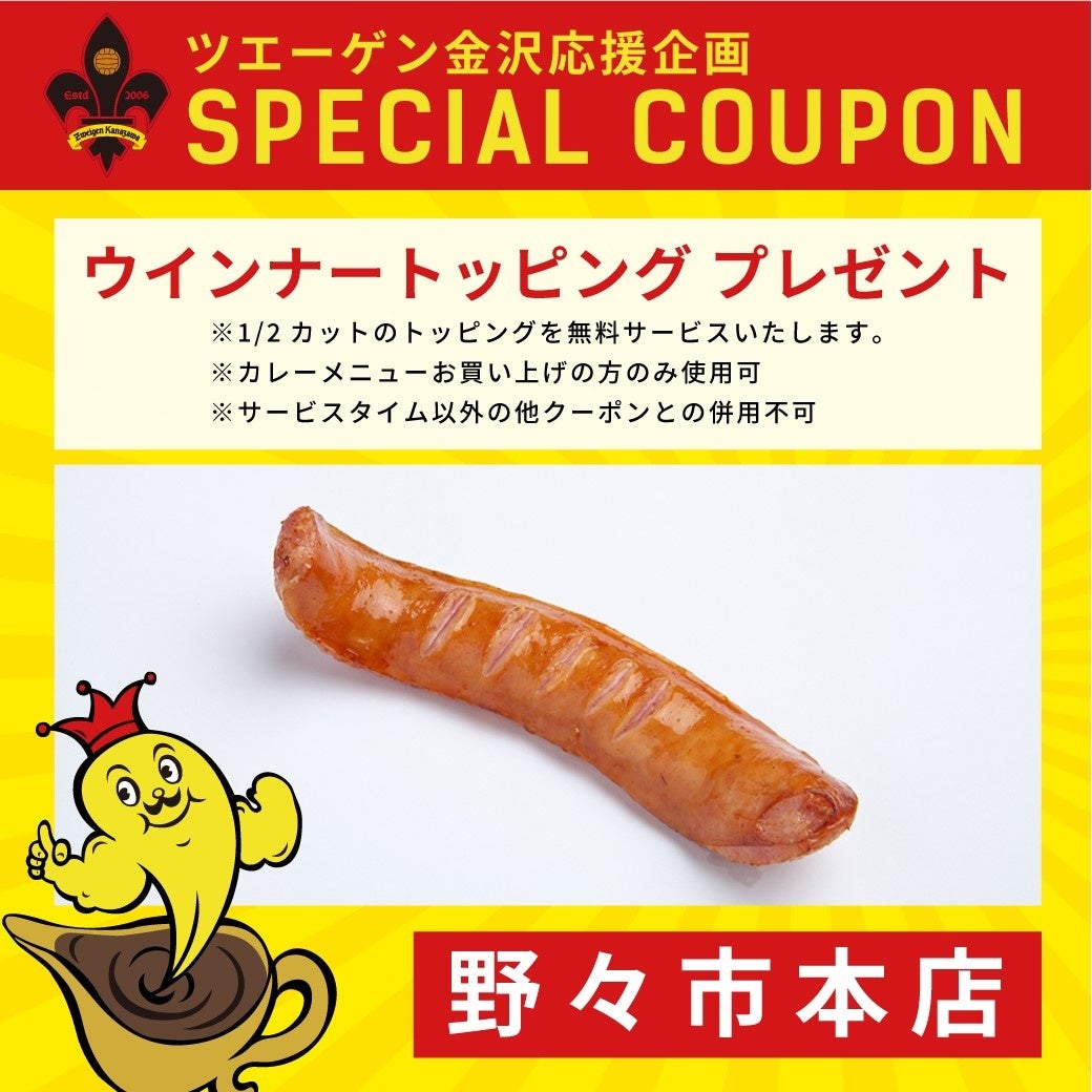 さらに、ツエーゲン金沢公式LINEをご登録いただいた方には、チャンピオンカレーの1/2ウインナートッピング無料クーポンを取得いただけます。
