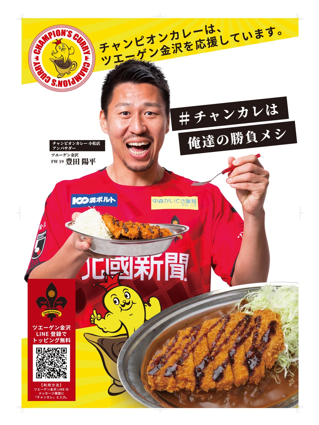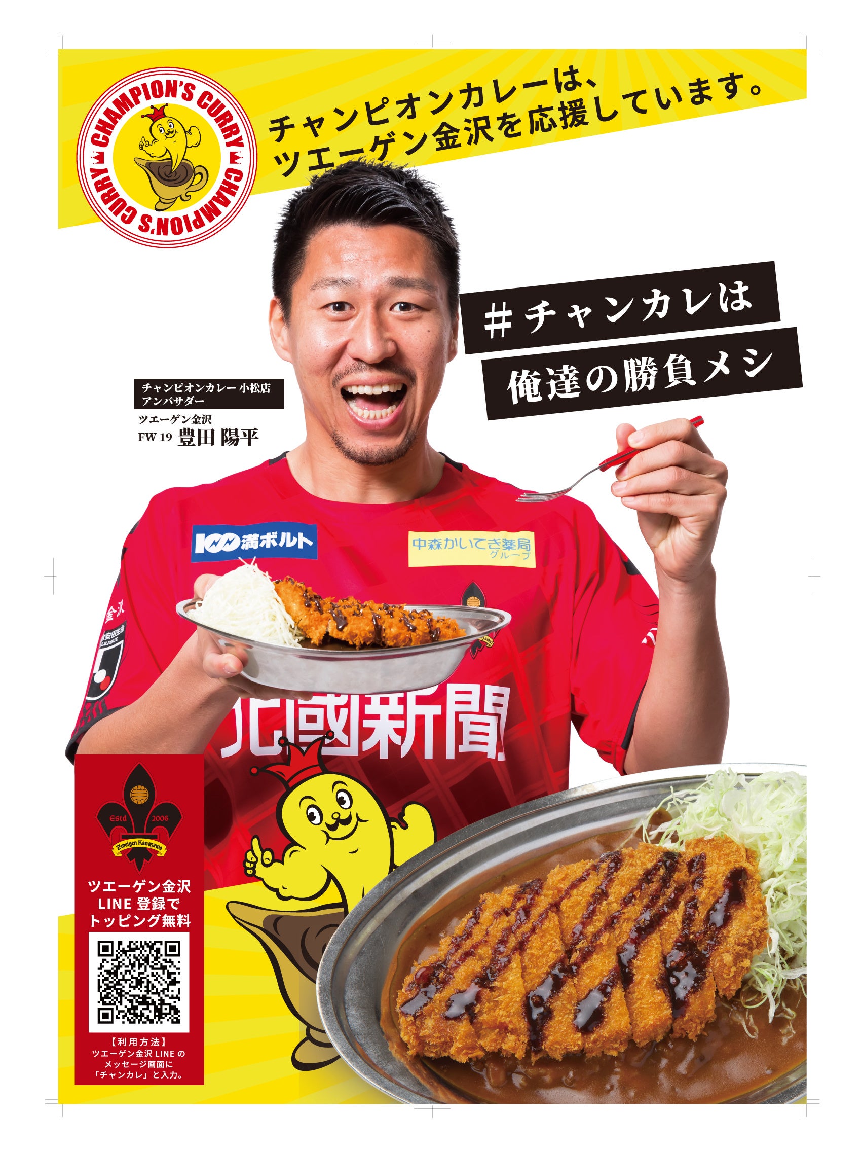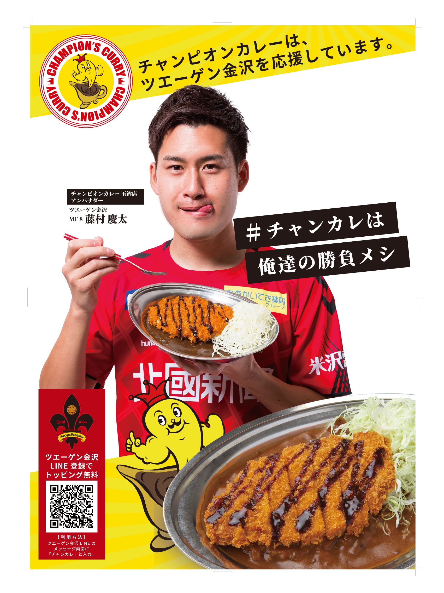 「チャンカレは俺達の勝負メシ」を共同メッセージとし、明治安田生命J2リーグを舞台に闘うツエーゲン金沢の選手たちをチャンピオンカレー県内各店舗のアンバサダーに任命し、勝負に挑む方々を応援していきます。
