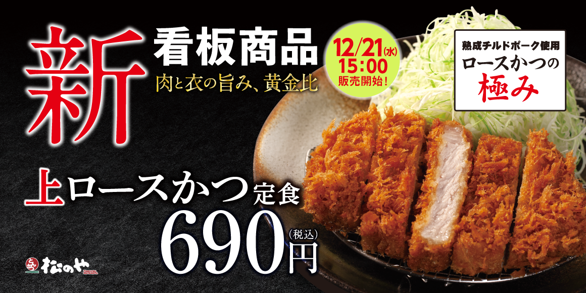 株式会社松屋フーズ(本社:東京都武蔵野市、代表取締役社長:瓦葺 一利)では、とんかつ専門店の「松のや・松乃家」におきまして、2022年12月21日(水)午後3時より、「上ロースかつ」を発売いたします。