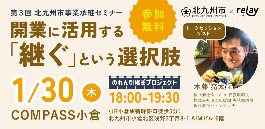 【1月30日(木)開催】オープンネーム事業承継「relay(リレイ)」と福岡県北九州市が連携し、事業承継セミナー「開業に活用する“継ぐ”という選択肢」を開催!