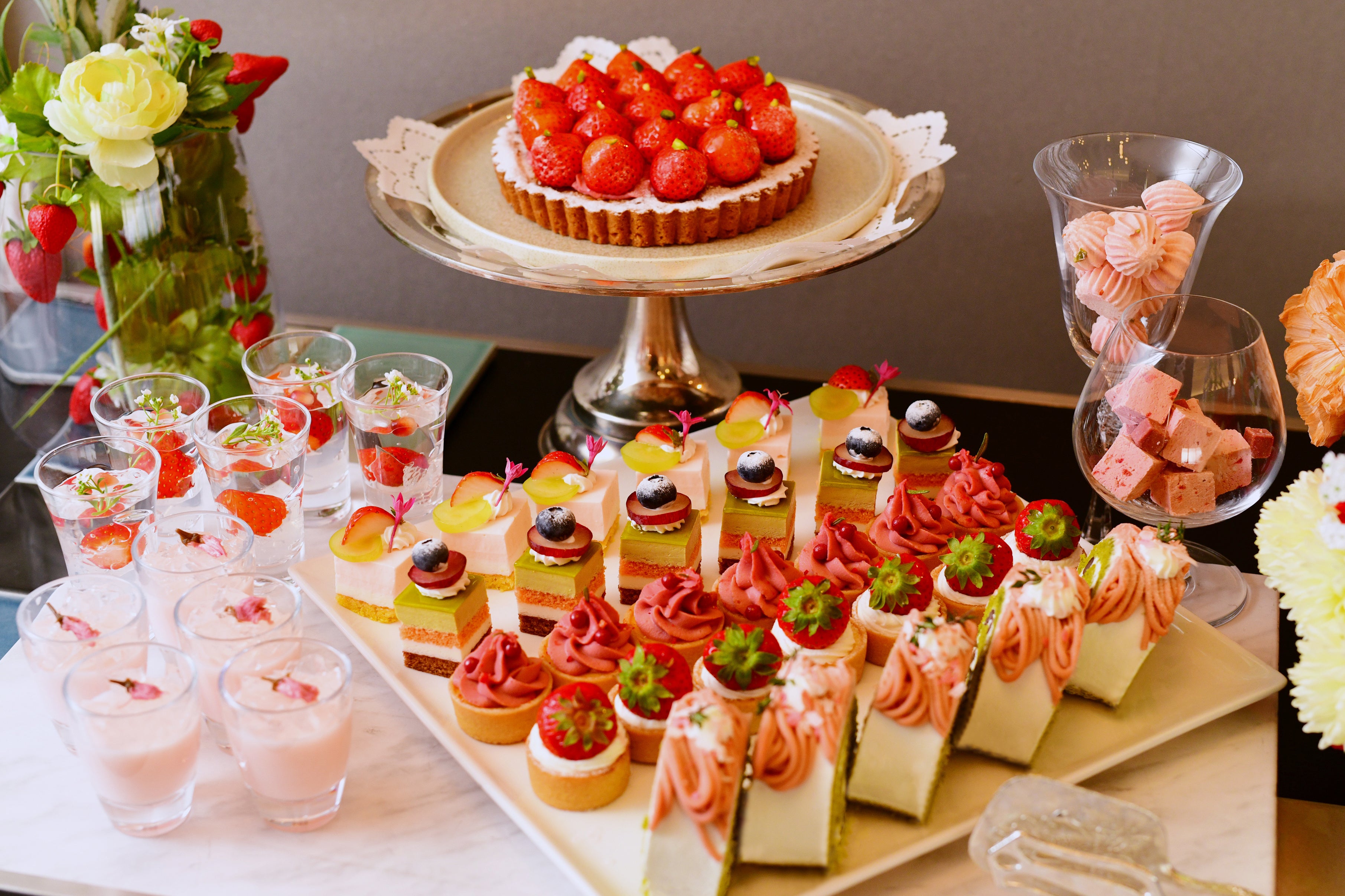イチゴをふんだんに使用したデザートに加え、抹茶のデザートもご用意しております。