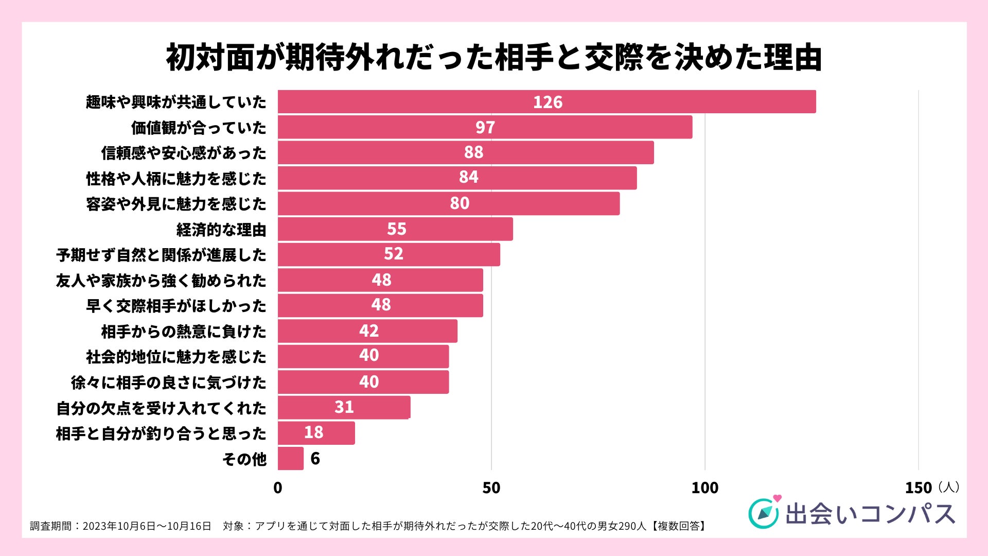 趣味や価値観など、何かを選択したり経験したりする上で、意見が合致しやすくなる要素が、期待通りではない相手との交際の決め手となっているのではないでしょうか。