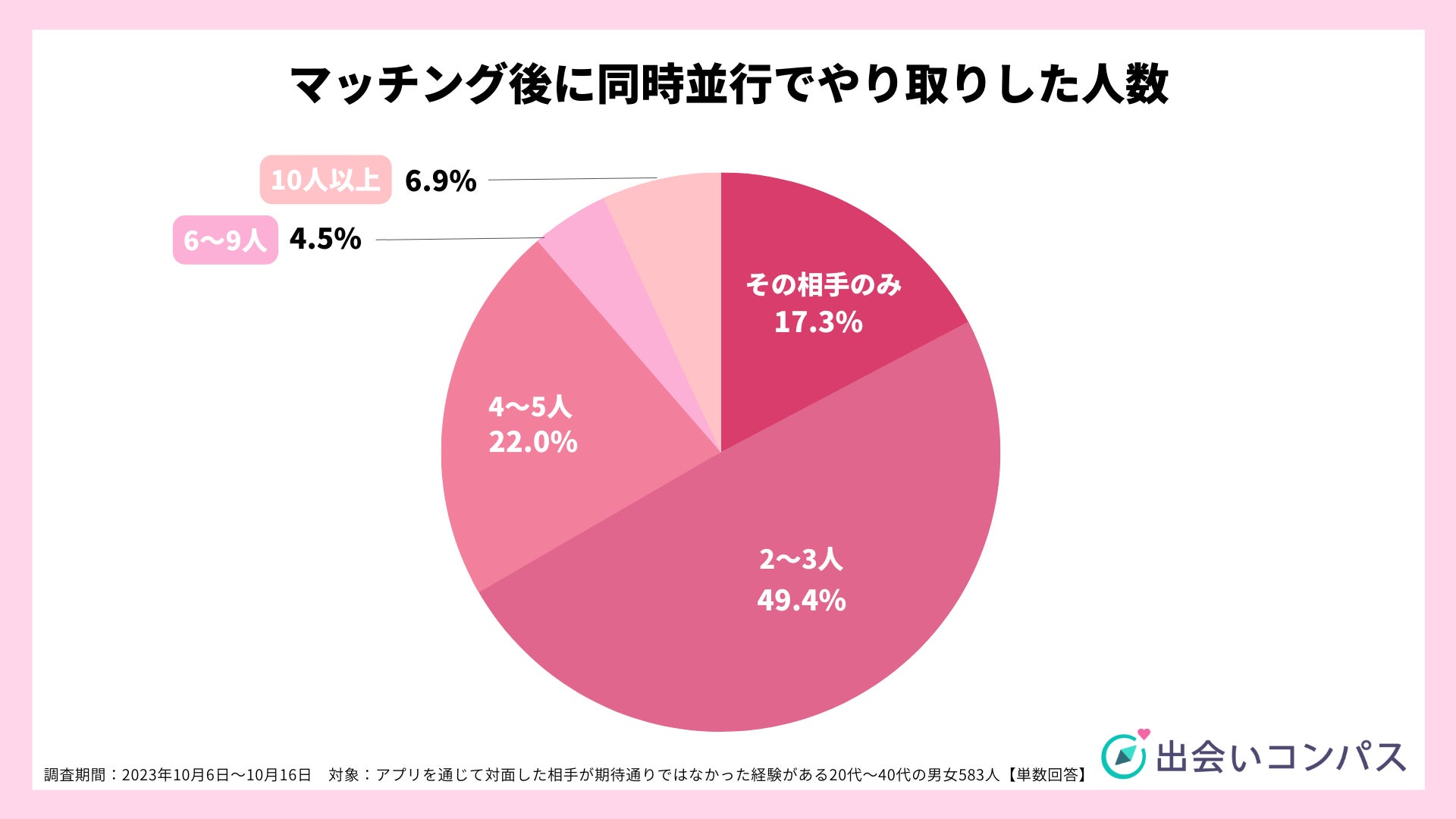 期待通りではなかった相手を含め、何人と同時にやり取りをしていたかを聞いてみると、「2~3人(49.4%)」が最も多く、次いで「4~5人(22.0%)」、「その相手のみ(17.3%)」でした。