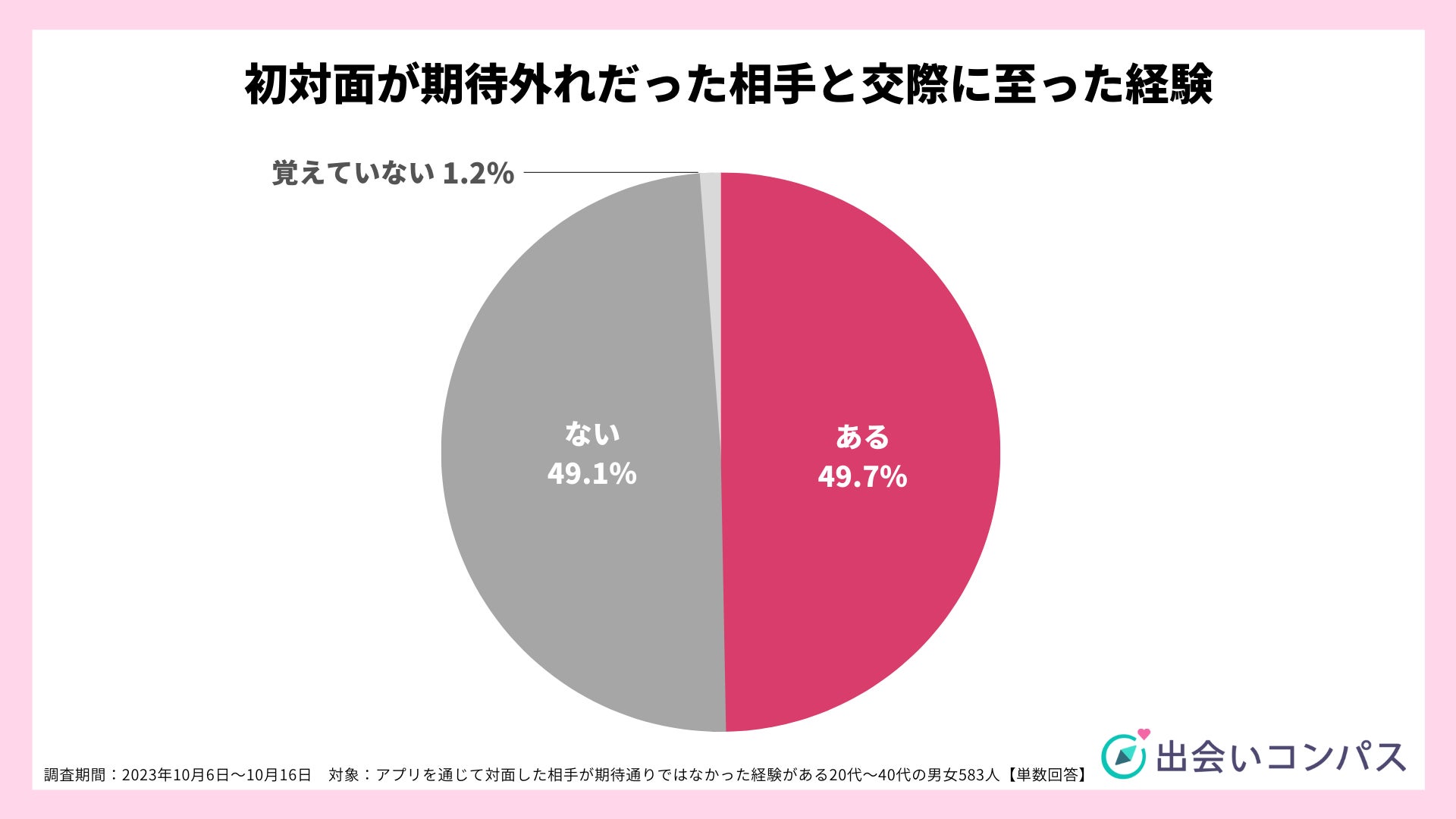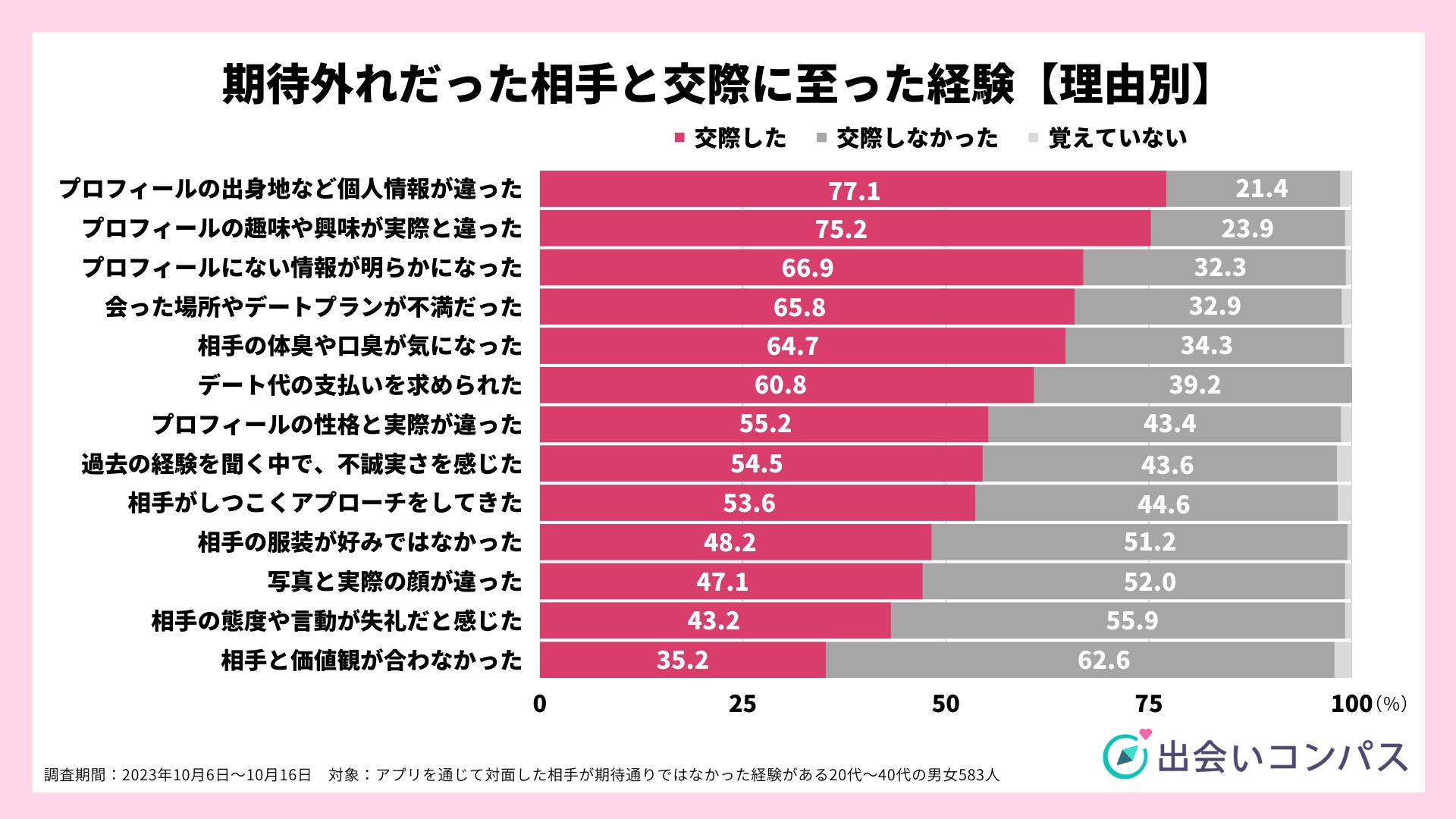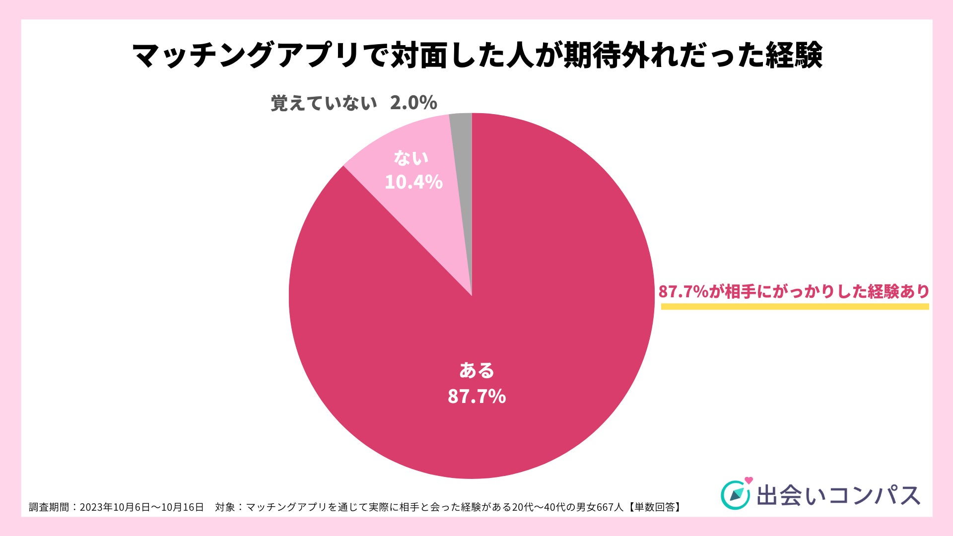 ナイル株式会社(本社:東京都品川区、 代表取締役社長:高橋飛翔、 以下ナイル)が運営する恋愛・婚活メディア「出会いコンパス」にて、 2023年10月6日から10月16日の期間、 マッチングアプリを通じて実際に相手と会った経験がある20~40代の男女667人を対象に、期待外れだった相手に関するアンケート調査を実施いたしました。
