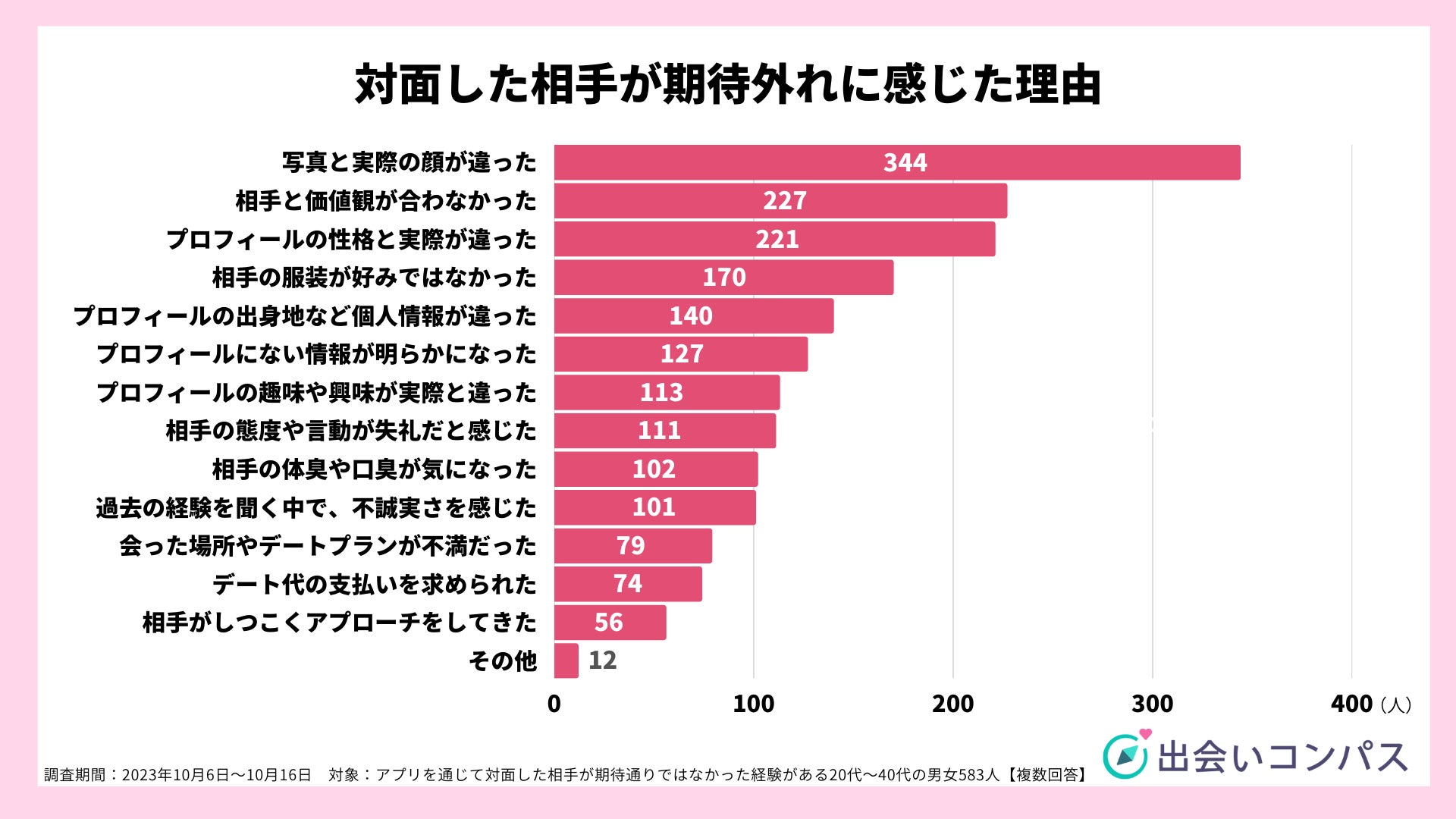 実際に会った相手が、自分の期待通りではなかった経験があると回答した583人の理由を調査すると、最も多いのが「プロフィール写真と実際の顔が違った(344人)」、次いで「会って話してみたら、相手との価値観が合わなかった(227人)」、「プロフィールにある性格が実際と違うように感じた(221人)」でした。
