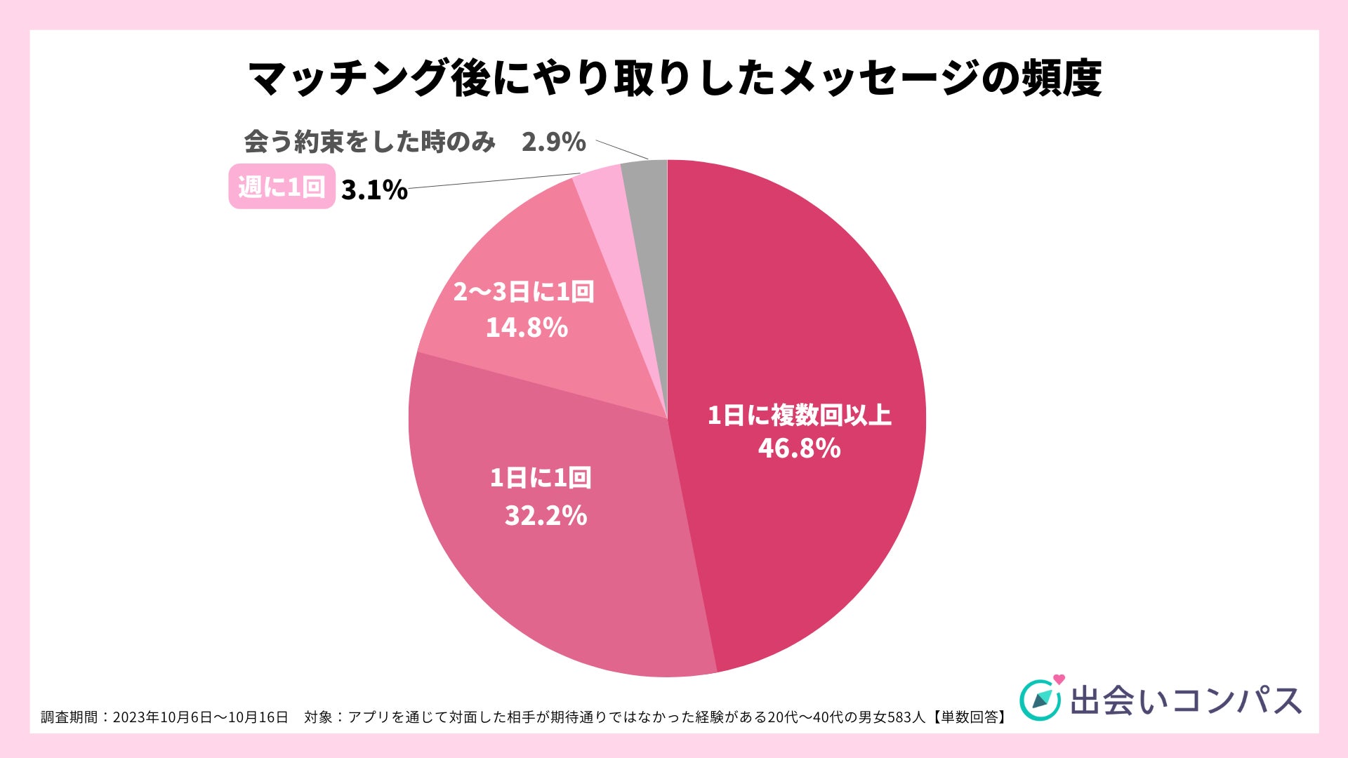 期待外れだと感じた相手との連絡頻度を聞いてみると、「1日に複数回以上(46.8%)」が最も多く、次いで「1日に1回(32.2%)」、「2~3日に1回(14.8%)」という結果でした。
