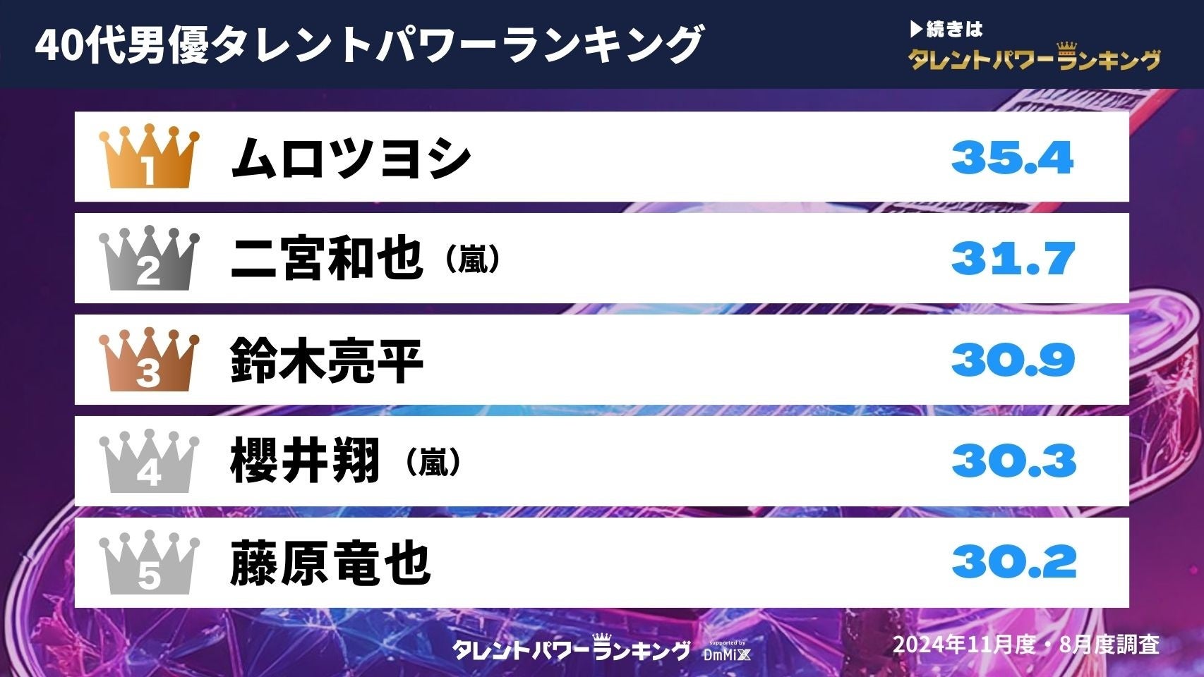 『タレントパワーランキング』では、タレントパワーランキングに登録されている、2025年2月1日時点で年齢が40代男優のパワースコアを調査。