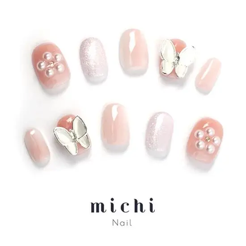 春らしい淡いピンクと蝶々がキュートなネイル。ちゅるんとした艶感とパールのお花が可愛いデザインです。デートやライブにつけていきたい女子力高めのネイルチップです。
