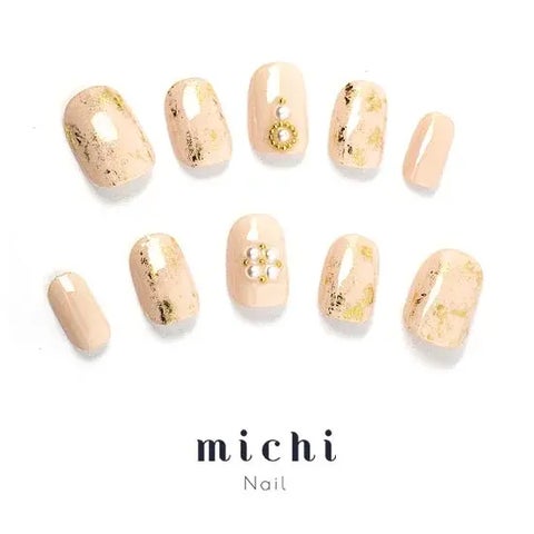肌になじむベージュカラーにゴールドのアートを施した高級感ネイル。パールとゴールドのホイルでゴージャスなデザインです。カラーが上品なので、洋服の色を問わず使いやすいネイルチップです。