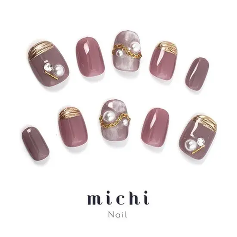 チェーンパールとダスティーピンクのミラーアートネイル・ナチュラルスイートネイル・大人なゴールドパールネイルetc..