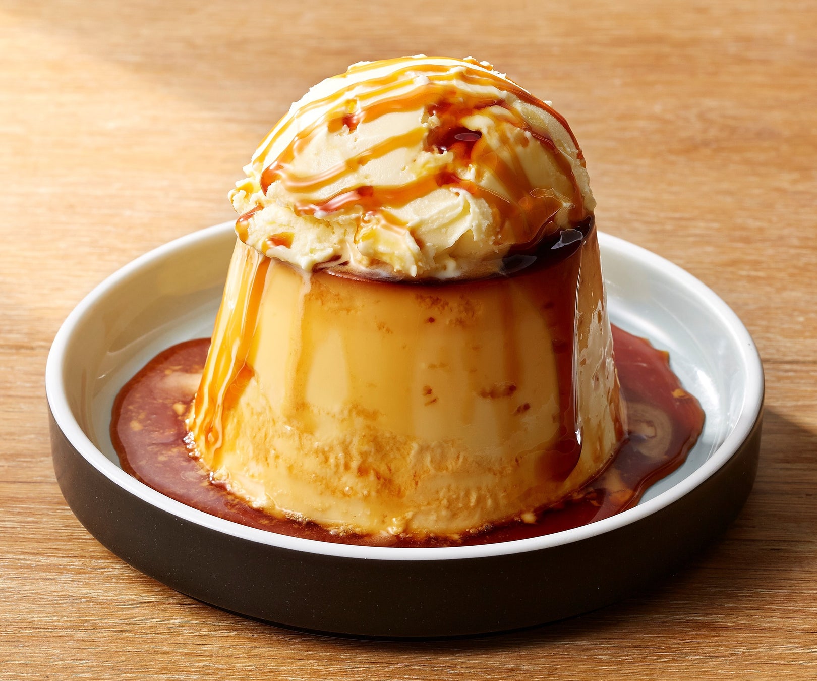 かためのプリンにアイスをのせて、カラメルソースをたっぷりかけました。