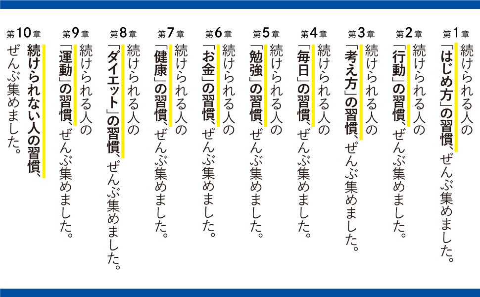 本書では、「続けられる人」の習慣を、日常生活、行動心理、メンタル、思考法、脳科学など、さまざまな側面から紹介します。