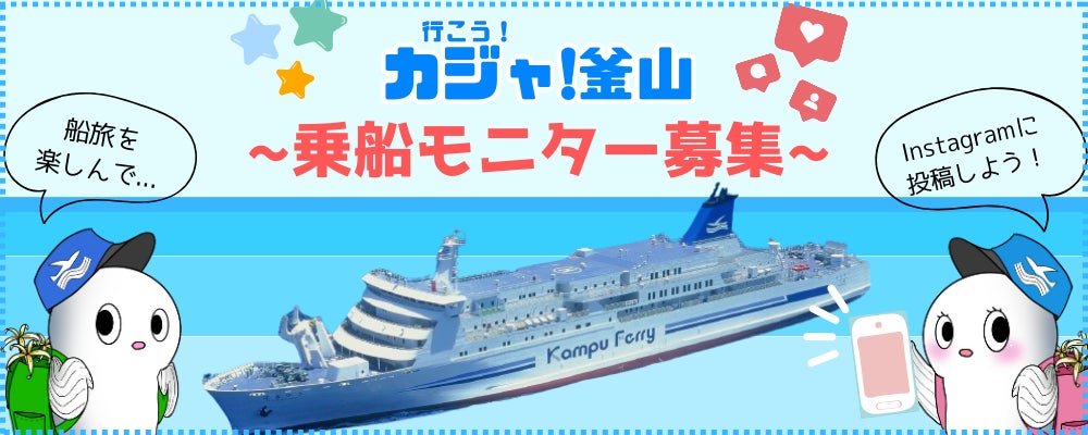 近年、若い世代の韓国旅行への関心が高まっていることを受け、当社フェリーに乗船していただき、釜山への“船旅”の魅力を発信していただく若年層向けのモニター乗船キャンペーン「가자(カジャ)※!釜山」の参加者を募集いたします。
