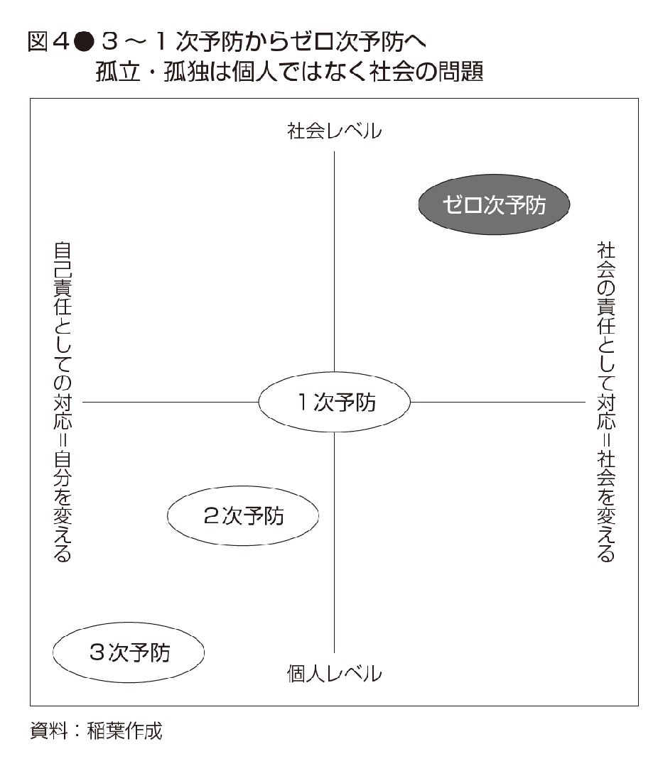 孤立・孤独問題について作成したものですが、本質的な問題はゼロ次予防という意識を持たないと解決できないのではないかと考えます。 人は人間関係のなかで存在しているのですから、「生きることは自己責任」という考えは現実にそくしたものとはいえないと考えます。