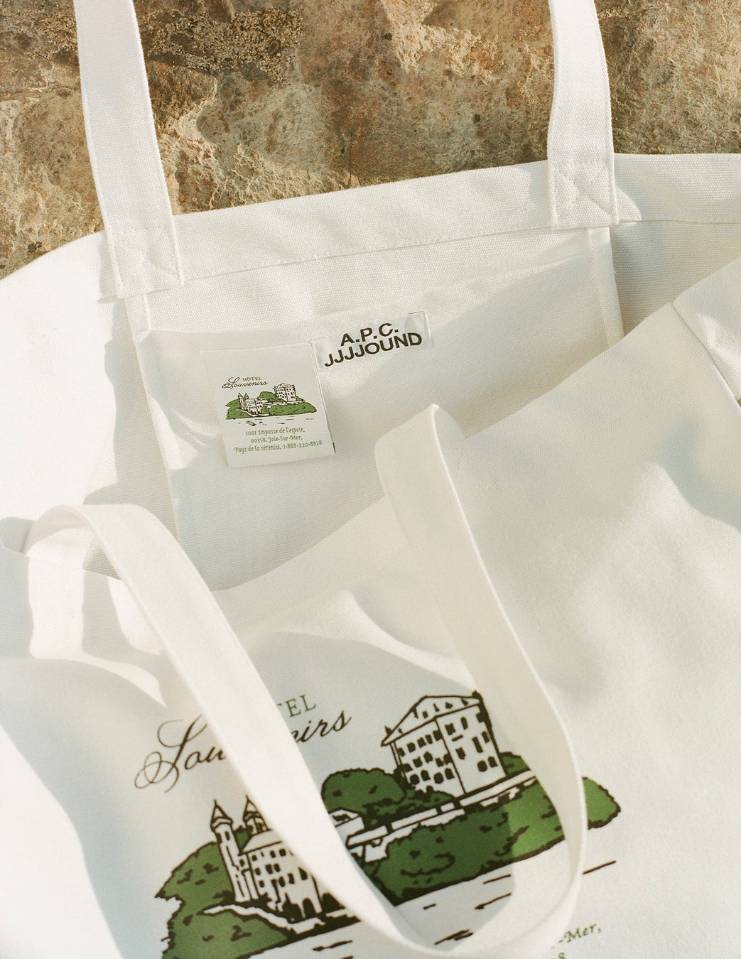 二つ目のテーマは全く異なるものとなっており、ホワイト、ブラック展開で、「Hôtel Souvenirs」のロゴが施されたスウェットシャツ、Tシャツ、キャップ、トートバックを展開しています。JJJJoundは、「今回のA.P.C.とのコラボレーションでは、全ての出来事が予想通り正確に起こるユートピアの世界における『架空のホテル』を考えました。これにより実際の表現よりコンセプトの優位性を際立たせています。」と語ります。