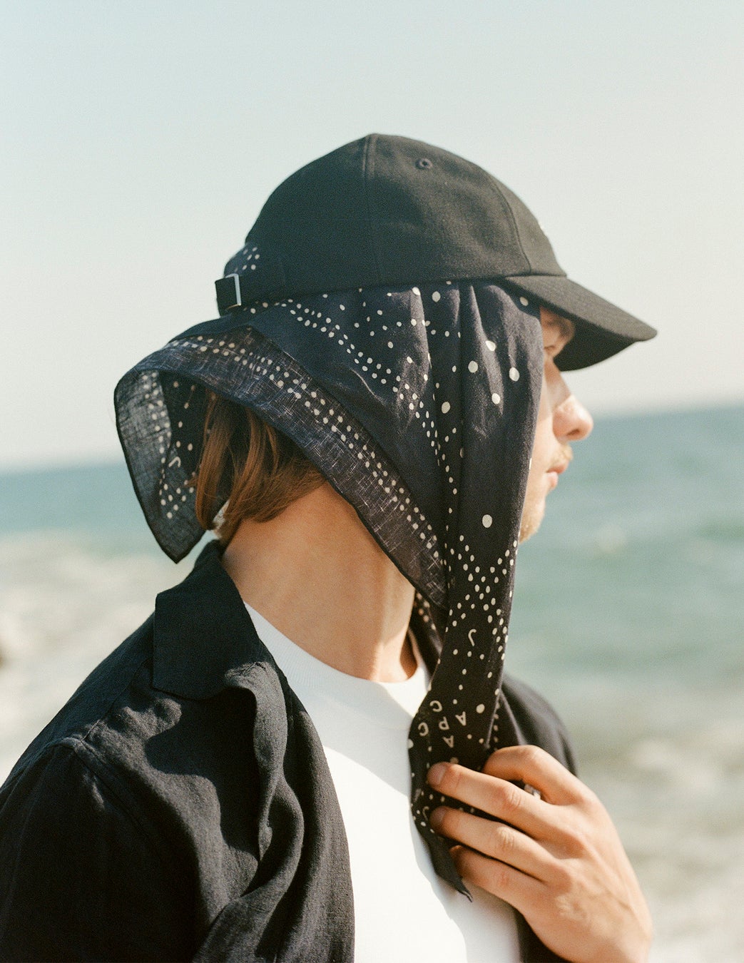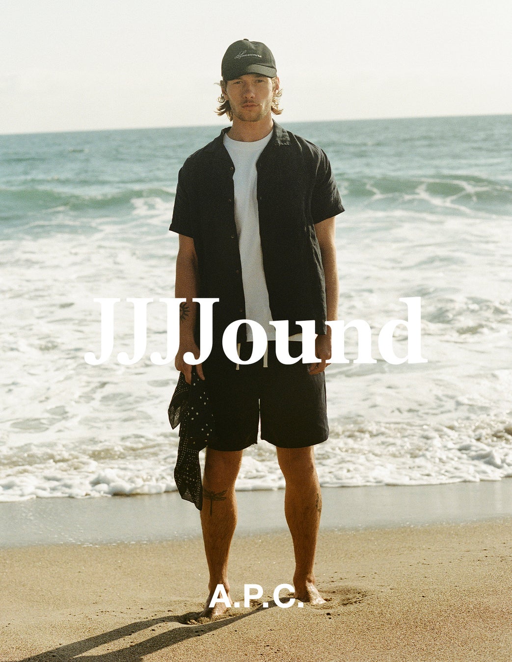 最初のテーマは、A.P.C. JJJJoundの控えめなロゴが施されたダークネイビーのモノクロームルック(シャツ、スイムショーツ、スカーフ)となっています。